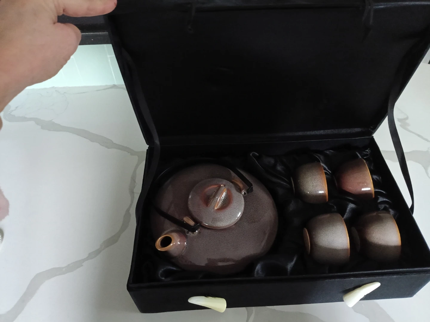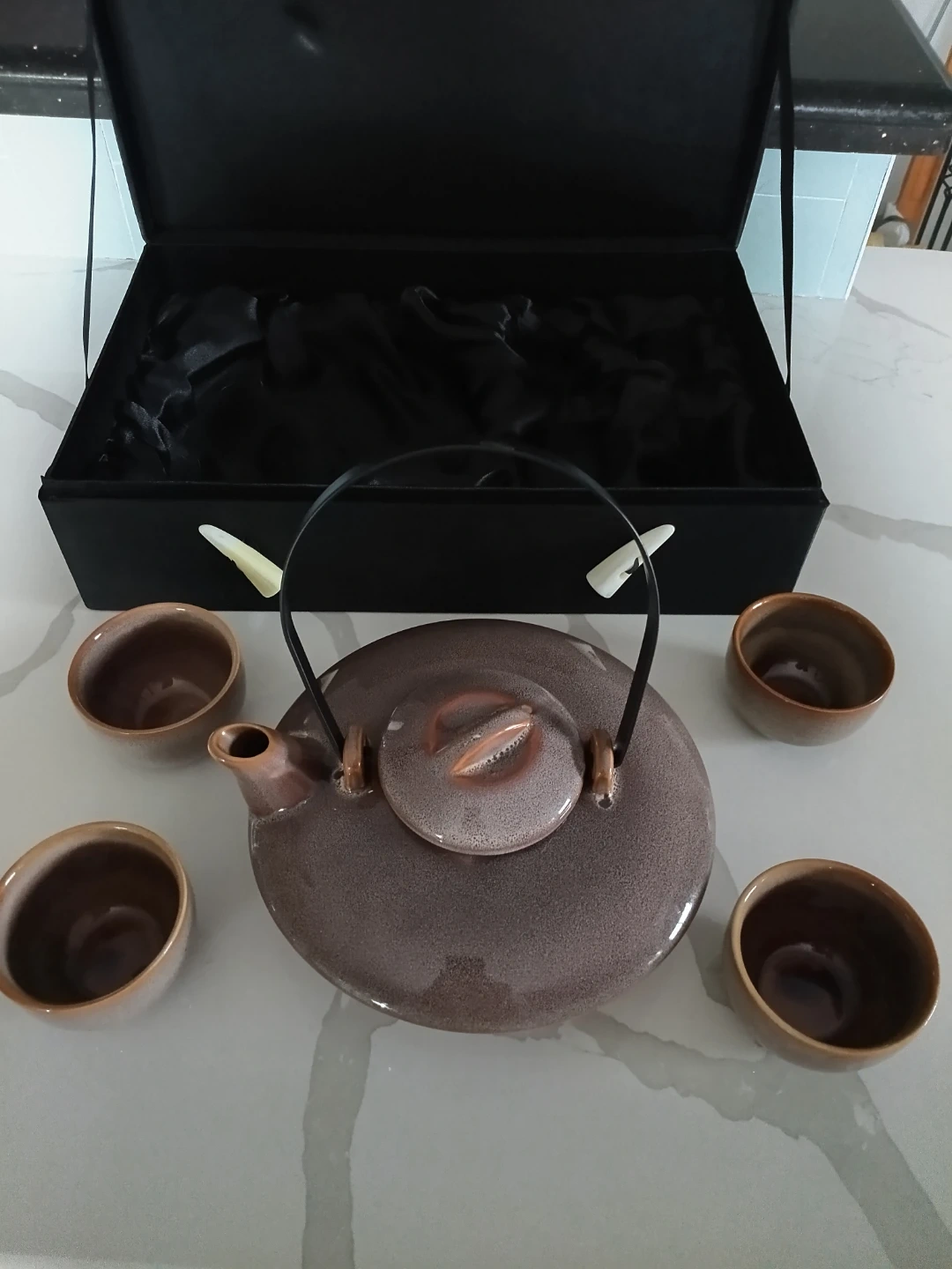 This is a Rhino 5-piece tea set, including one teapot and four cups. It comes with a metal tea strainer and is presented in a stylish black gift box. Made in China.
