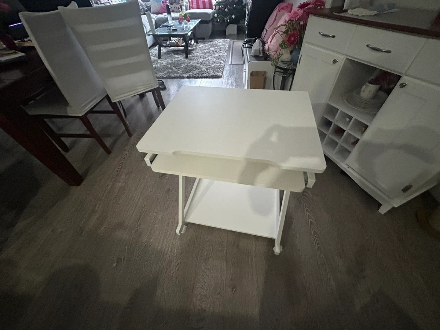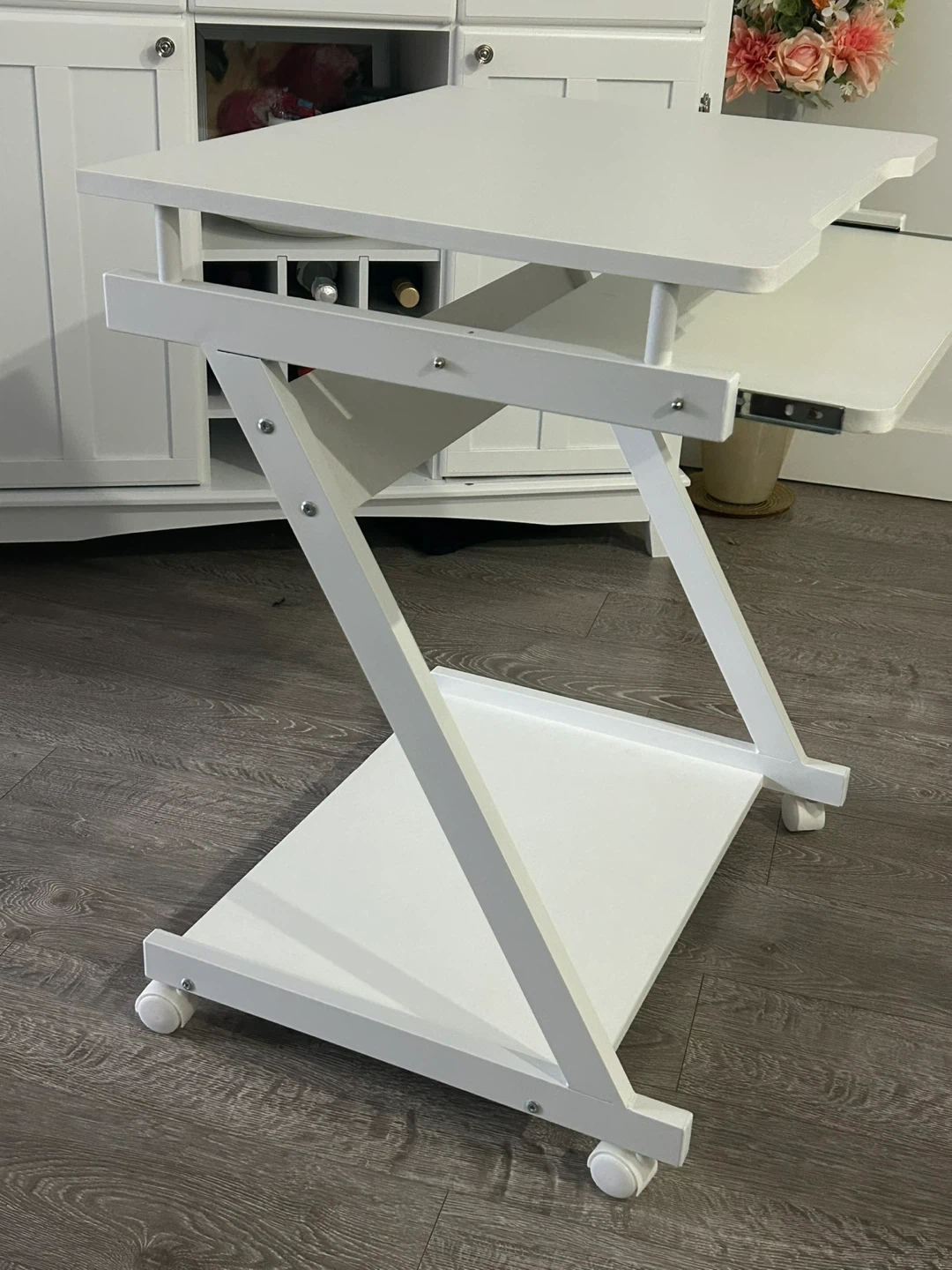 Soges movable desk with a keyboard tray and two shelves. It's white and has lockable wheels for easy movement. Perfect for a small workstation!
