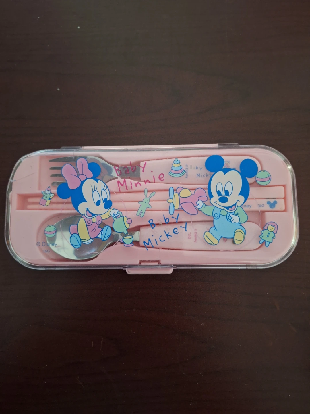 This adorable utensil set features Baby Mickey and Baby Minnie. It includes a fork, spoon, and chopsticks in a convenient carrying case. Perfect for little ones starting to self-feed!