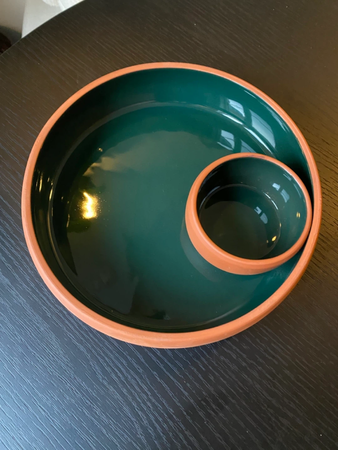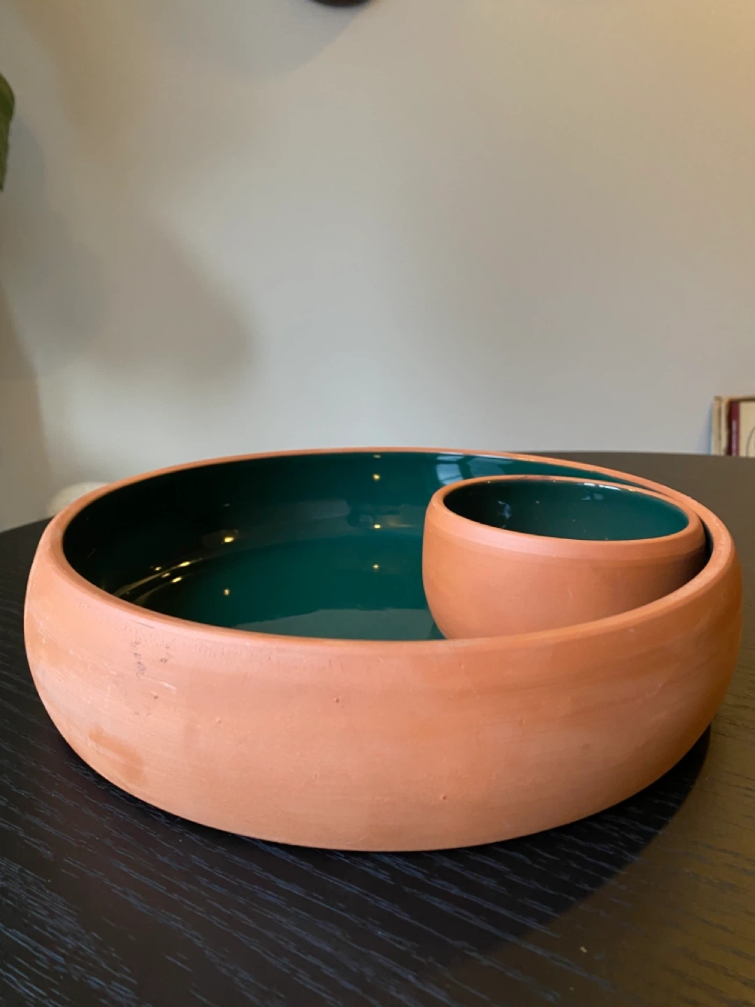 Expertly crafted in Portugal, this set perfectly captures the Organic Modern aesthetic, blending the raw, earthy texture of natural terracotta with a sophisticated, high-gloss hunter green interior glaze. The bowls are fused together in off Center placement.