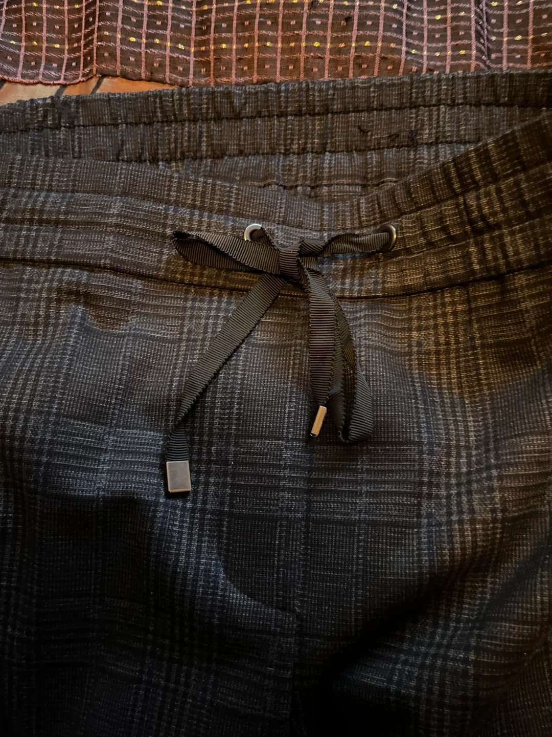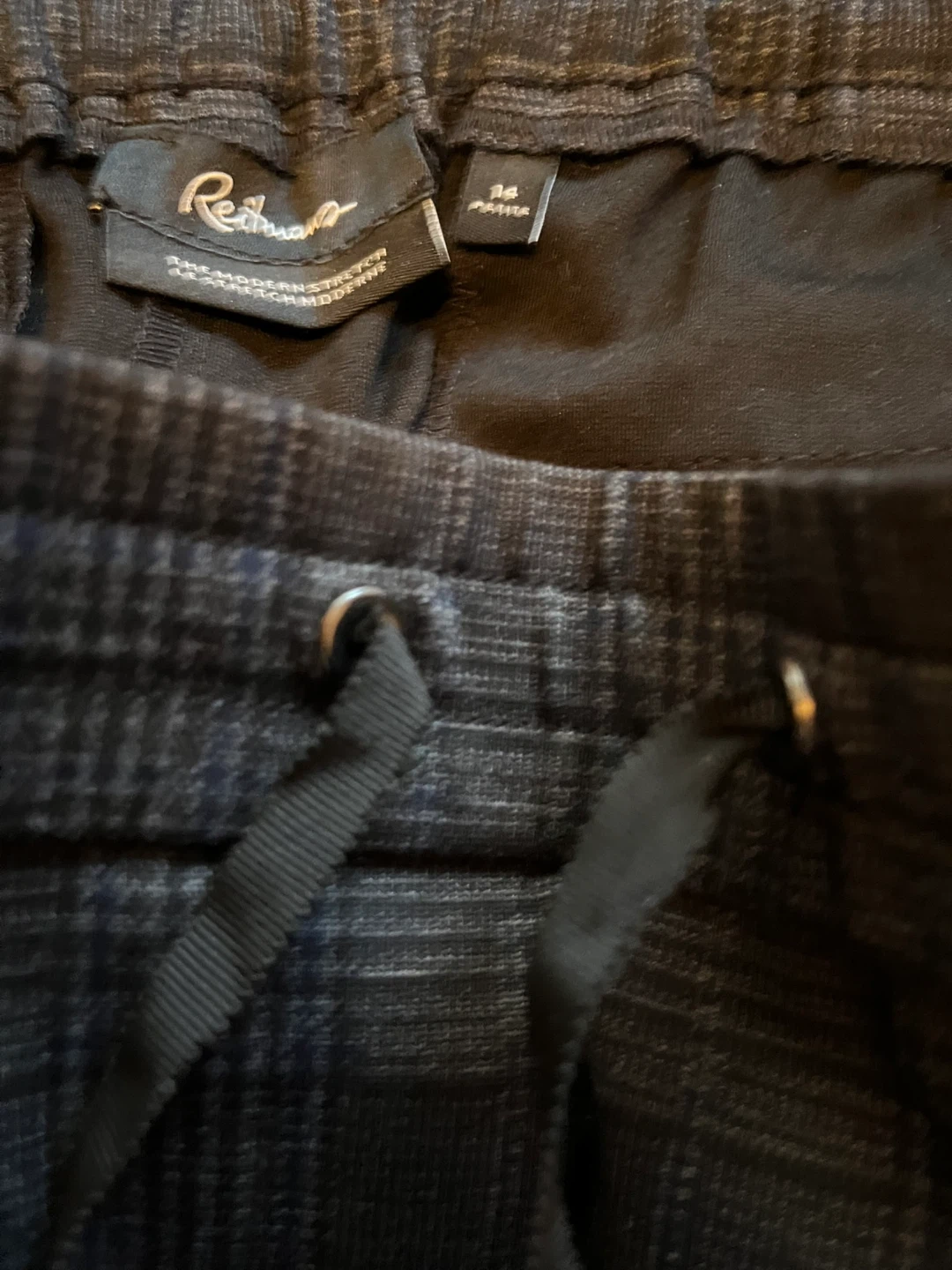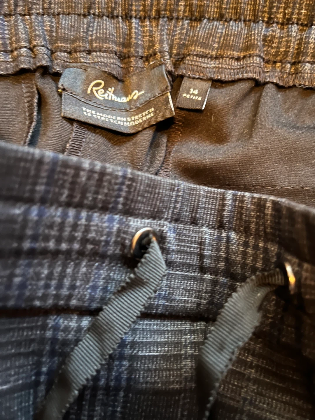 These Reitmans pants feature a classic plaid pattern with a modern stretch fabric. They're designed for comfort with an elastic waistband and drawstring. Size is 14 petite.