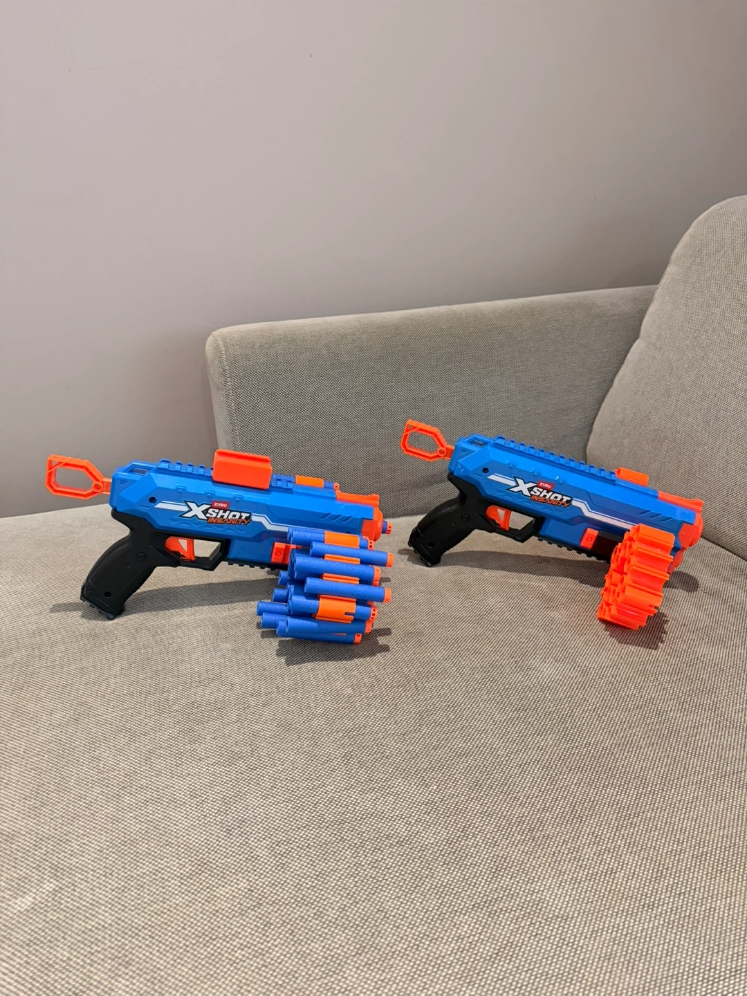 Two blue and orange X-Shot toy blasters included. Each blaster comes with two detachable dart drums. Plenty of fun for imaginative play!