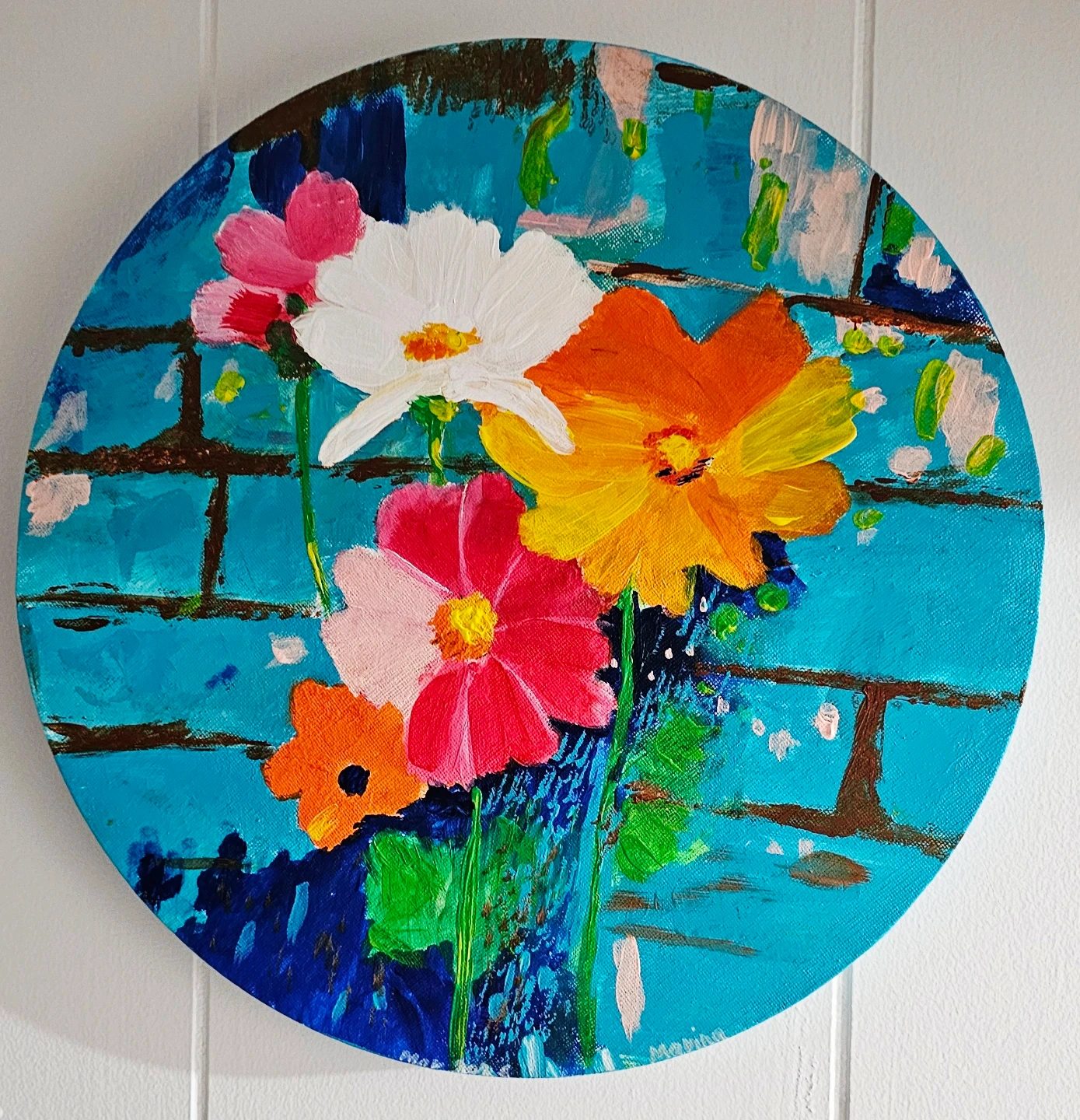 A vibrant, circular painting featuring a bouquet of colourful flowers against a bright blue brick background. The textured acrylic artwork showcases a mix of pink, white, orange, and yellow blossoms with green stems and foliage. It's a cheerful piece to brighten any space!