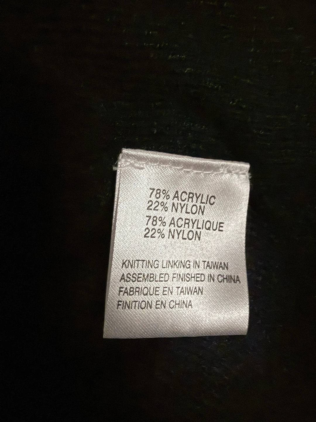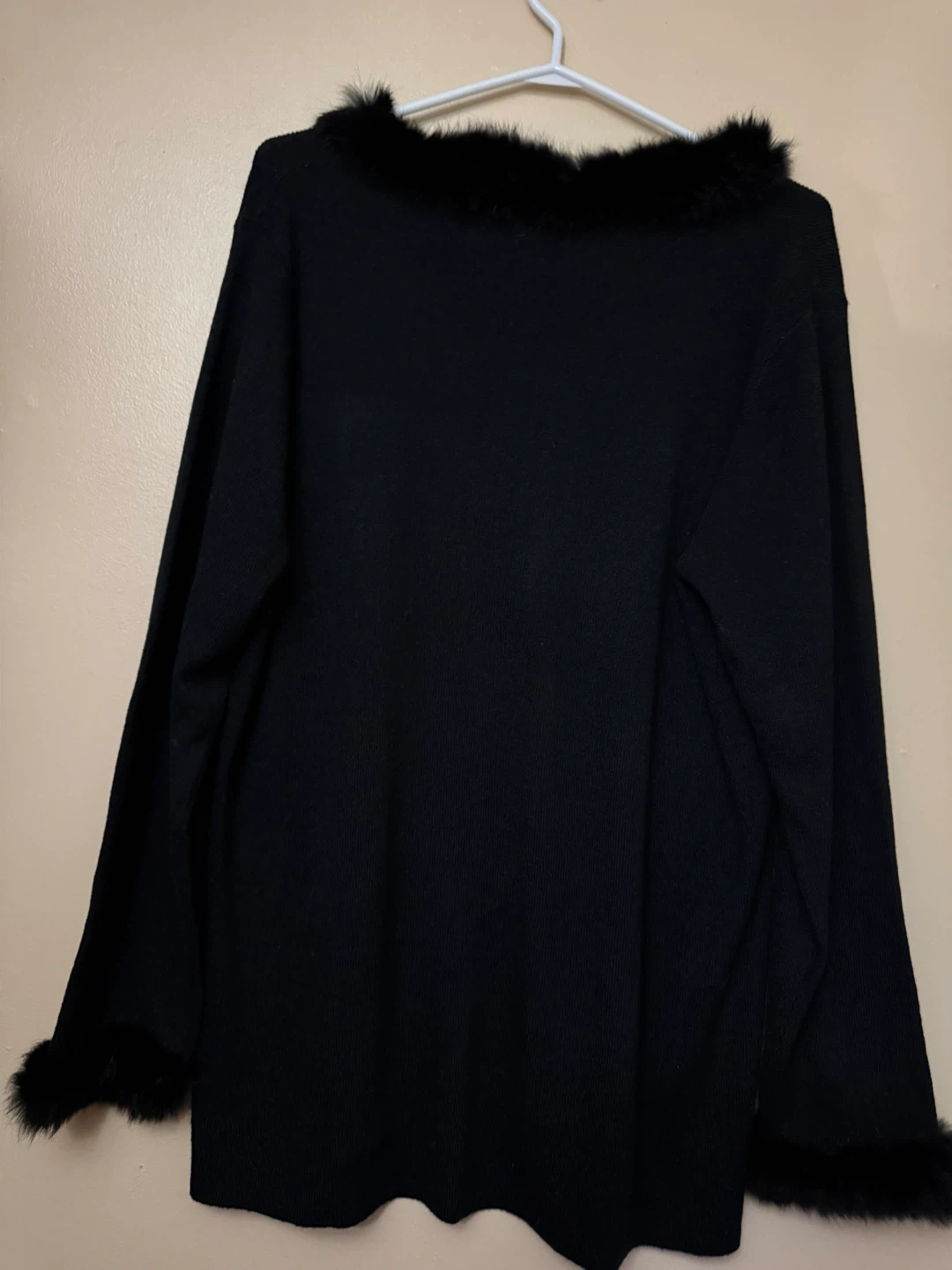 This is a black, long sleeve sweater with a soft, faux fur trim at the cuffs and neckline, giving it a chic and cozy look. The blend of 78% acrylic and 22% nylon ensures warmth and durability. I'd say this is in good used condition.