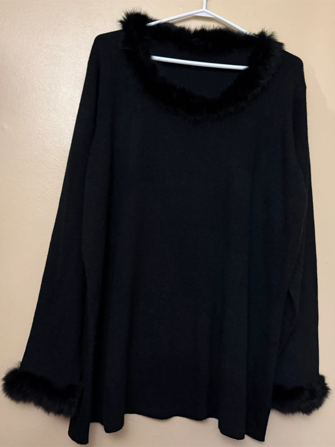This is a black, long sleeve sweater with a soft, faux fur trim at the cuffs and neckline, giving it a chic and cozy look. The blend of 78% acrylic and 22% nylon ensures warmth and durability. I'd say this is in good used condition.