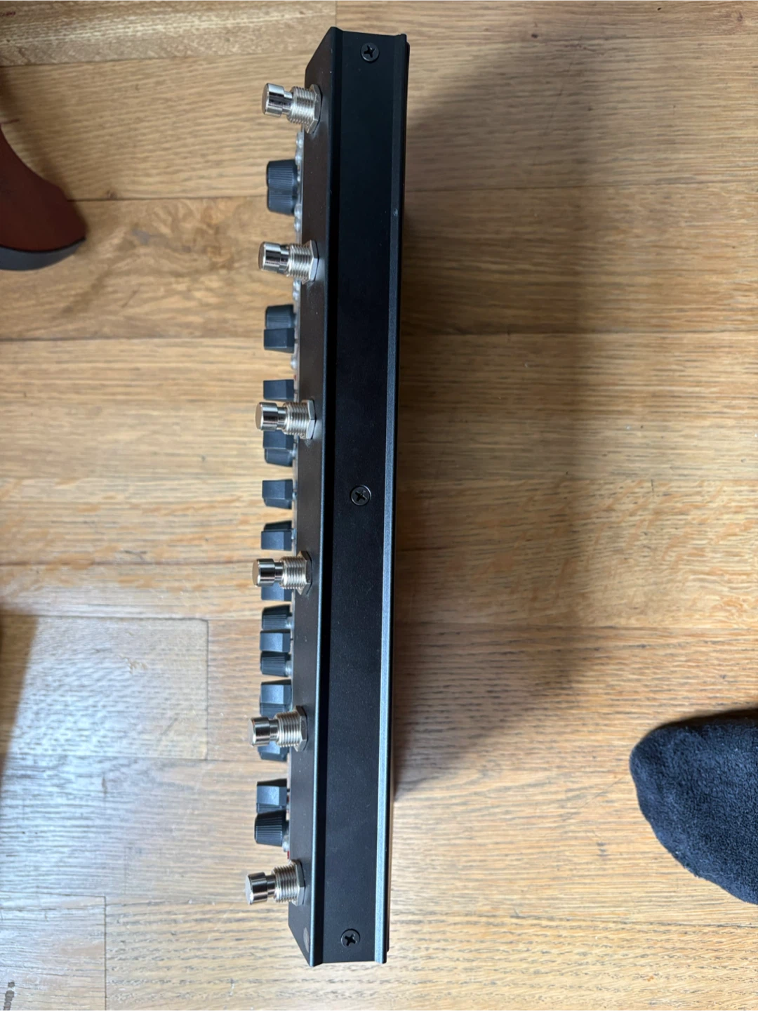 This looper is a powerhouse, featuring 6 mono tracks. Each track has a dedicated fader. It has 2 combo-jack inputs (mix preamp included), stereo outputs, with monitor and headphone jacks.