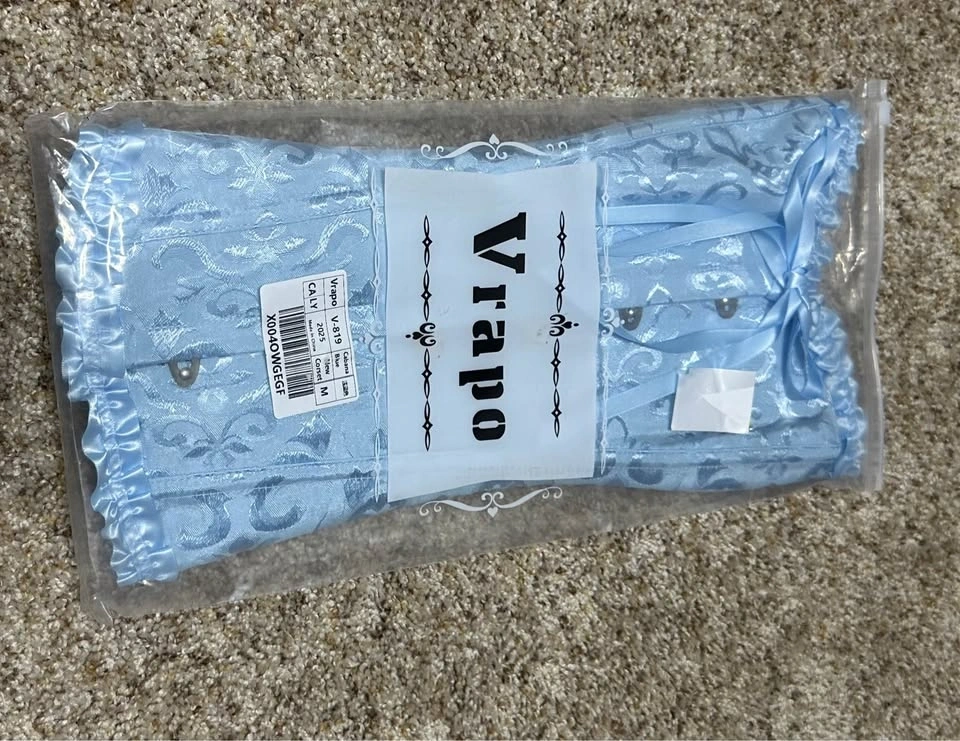 Beautiful Vrapo V-819 corset top in Cabana Blue. New with tags, size Medium. Has pretty floral pattern and ruffle trim. Front has hook-and-eye closure with decorative ribbon tie. Pickup SW / Terwillegar / meet on campus most weekdays. Check my other listings, bundle for deals!