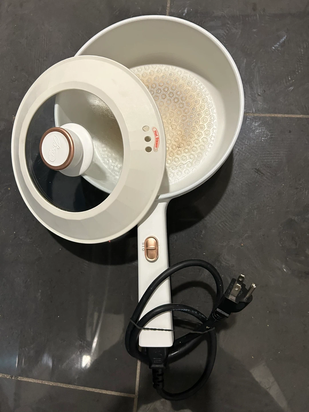 A white electric cooking pot with a transparent lid. It's a versatile kitchen appliance for various cooking needs. The pot has a non-stick interior and a simple control switch. It includes its power cord.