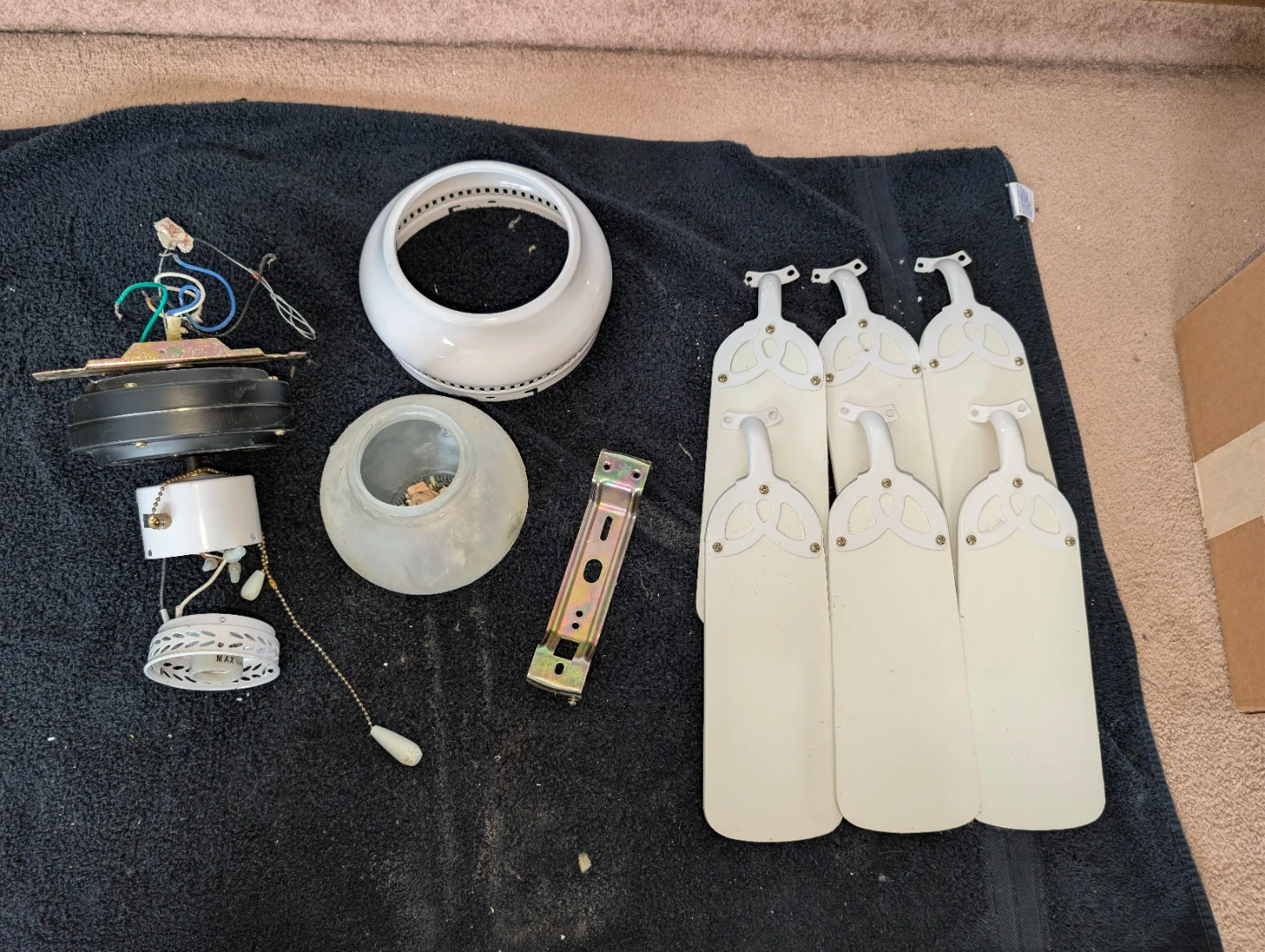 This listing includes parts for a white ceiling fan. It comes with five fan blades, the motor housing, a decorative cover, a glass light cover, and mounting hardware. It's a great set for repairs or customization!