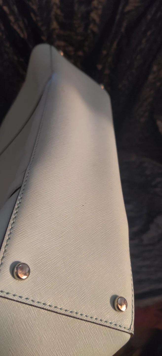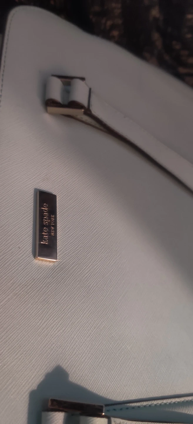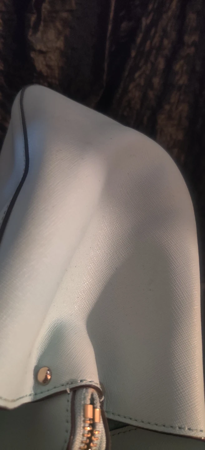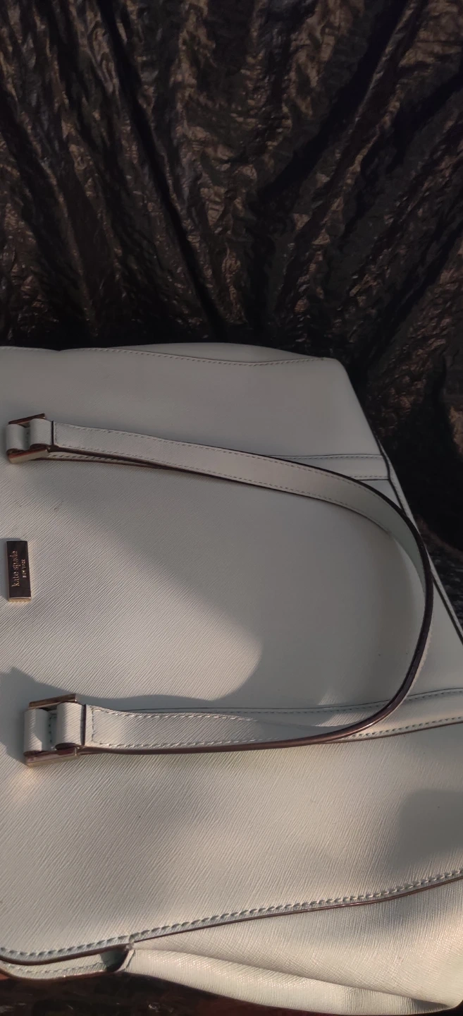 This is a light blue large size bag by Kate Spade New York. It features a zip-top closure and multiple interior pockets. The interior lining has the brand's signature spade pattern. 3 seperate compartments. Please look at pics. Bag is preowned so minor wear and stains should be expected.