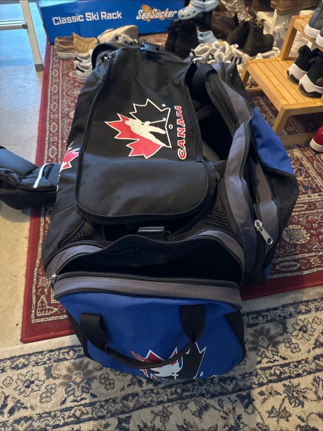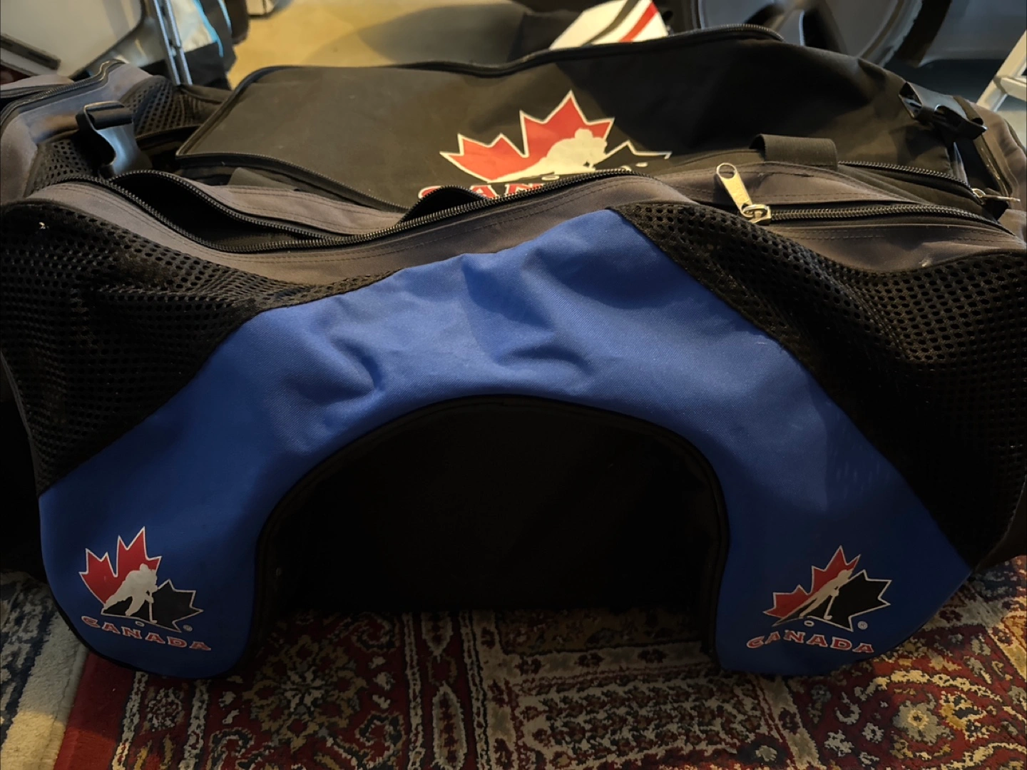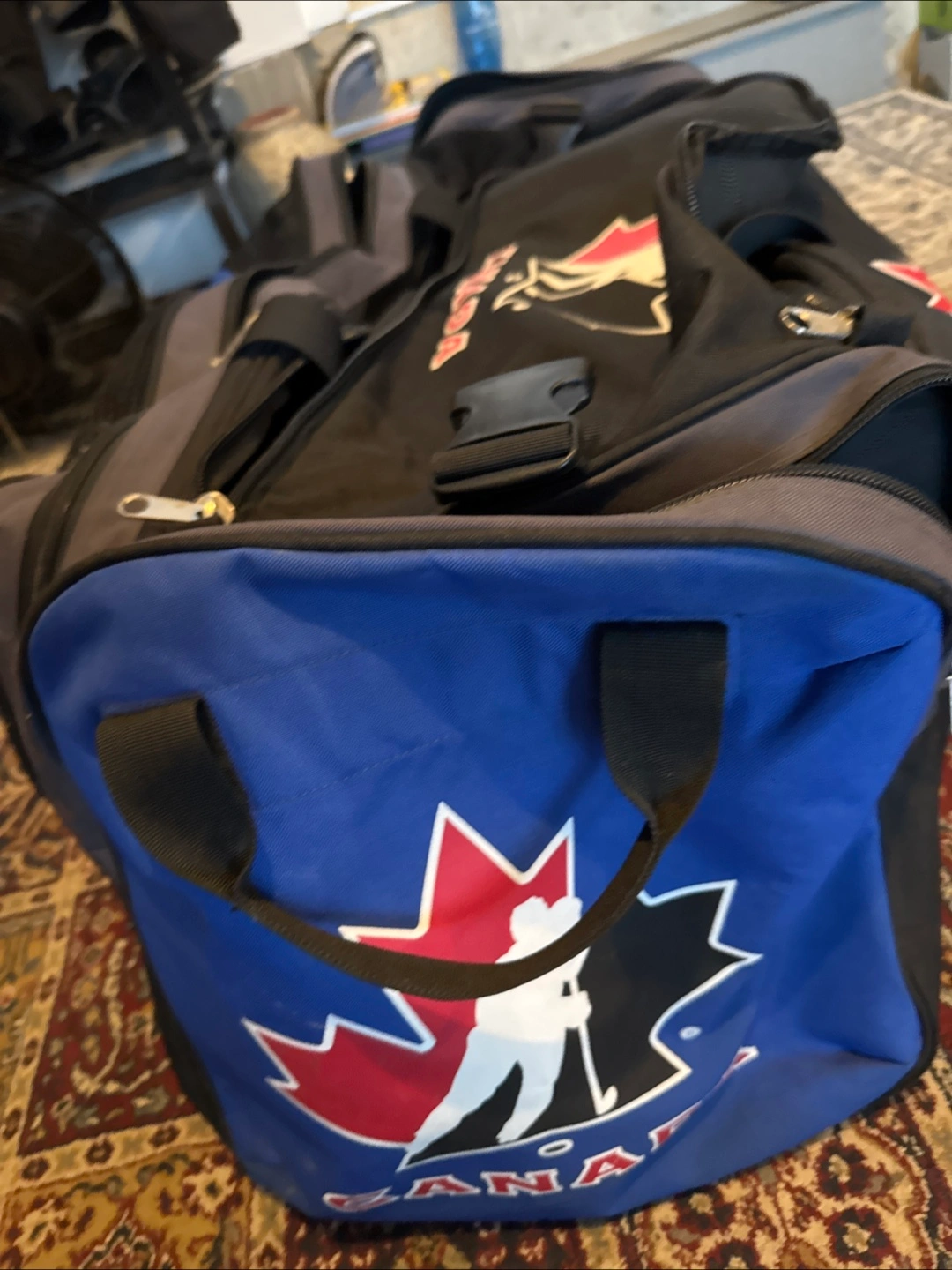 Selling a Canada hockey duffel bag in black and blue! It's in good condition and perfect for carrying all your hockey gear to the rink or storing equipment at home. Lots of space and sturdy construction! Has skate pockets as well. All zippers in perfect condition.