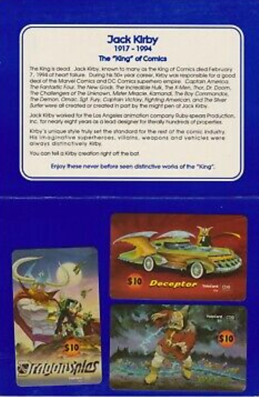Three $10 prepaid phone cards. Features artwork by Jack Kirby. Includes DragonSpin, Deceptor, and another character. Collectible.