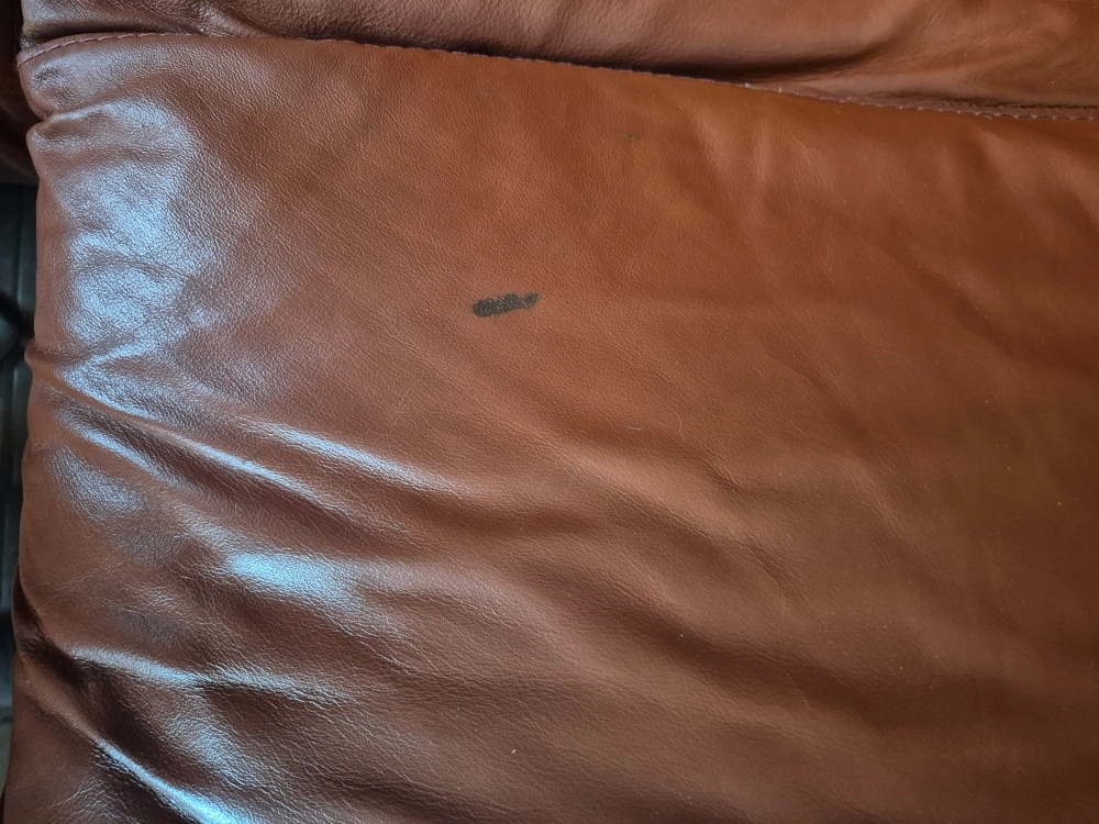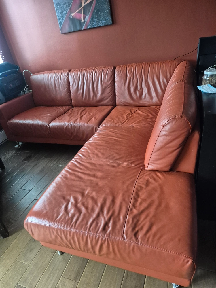 82Large IKEA HAMRA dark orange leather sectional. Some minor wear. Modern style. Comfortable seating. Metal legs. Size: 85 one side length, 95 other side length, 36 wide There are no rips or tears. There's one mini spot where the color faded See picture