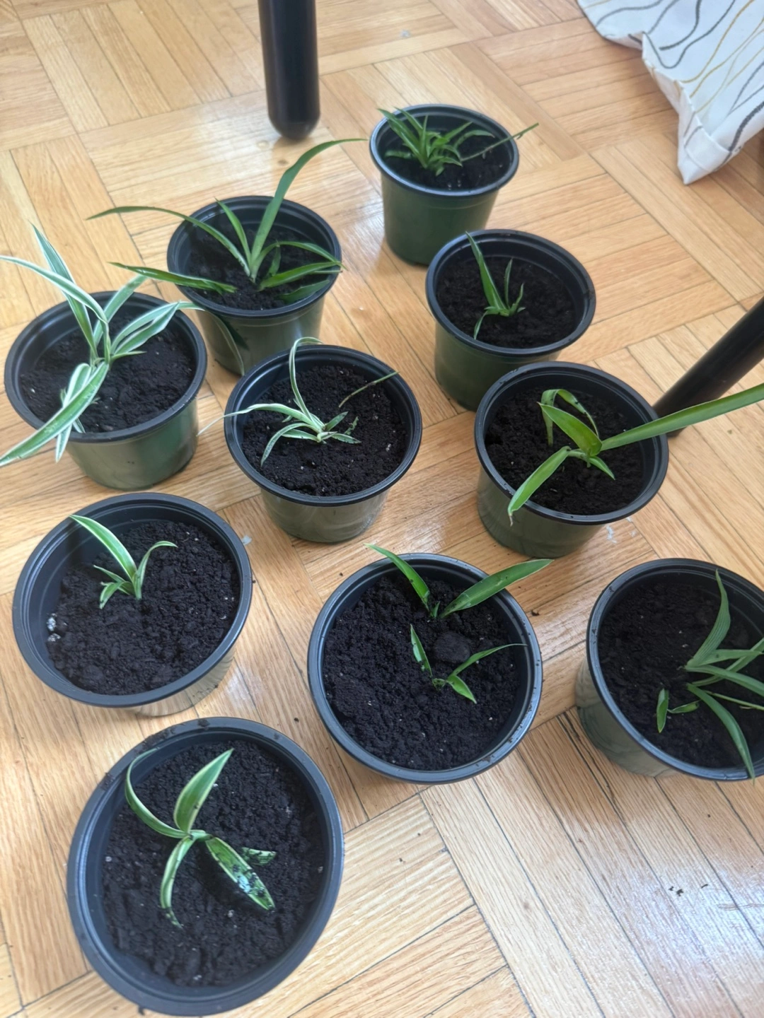 I've raised a baby spider plant army! These guys have been removed from their parent plant, roots grown in water, and planted into plastic pots.
