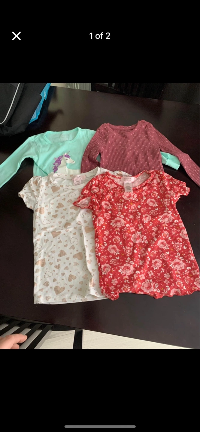 Four girls' tops. Includes long-sleeved teal shirt with unicorn graphic, maroon long-sleeved shirt, cream short-sleeved shirt with gold hearts, and red floral short-sleeved shirt.