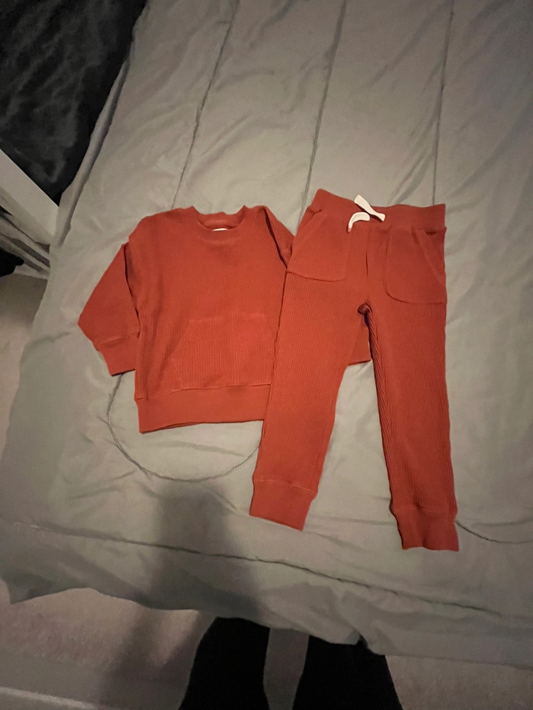 Bunch includes mint green polka dot leggings, a rust-coloured sweater and pants set, lavender floral leggings, and black leggings. Sizes vary. Pre-owned, good condition.