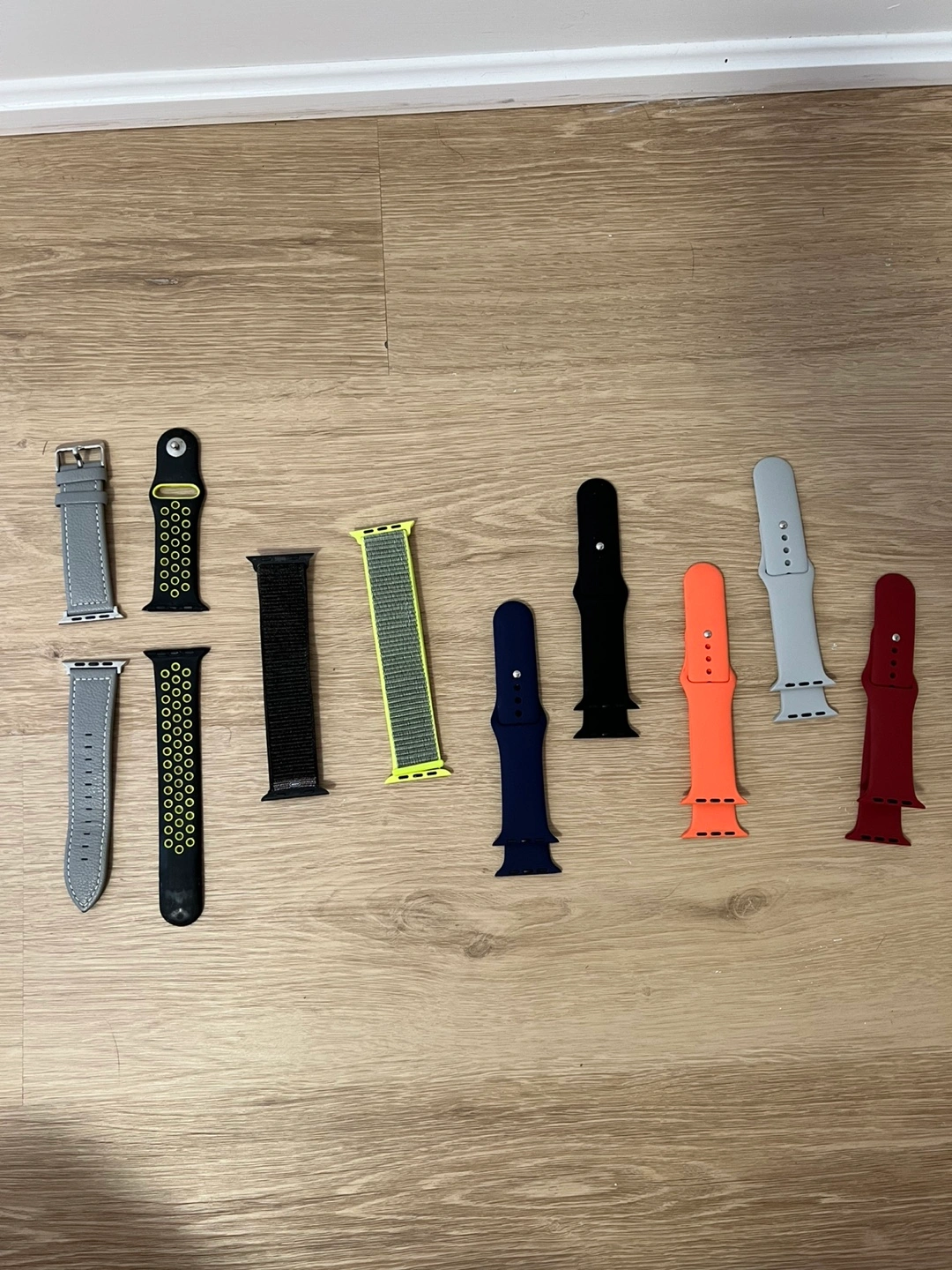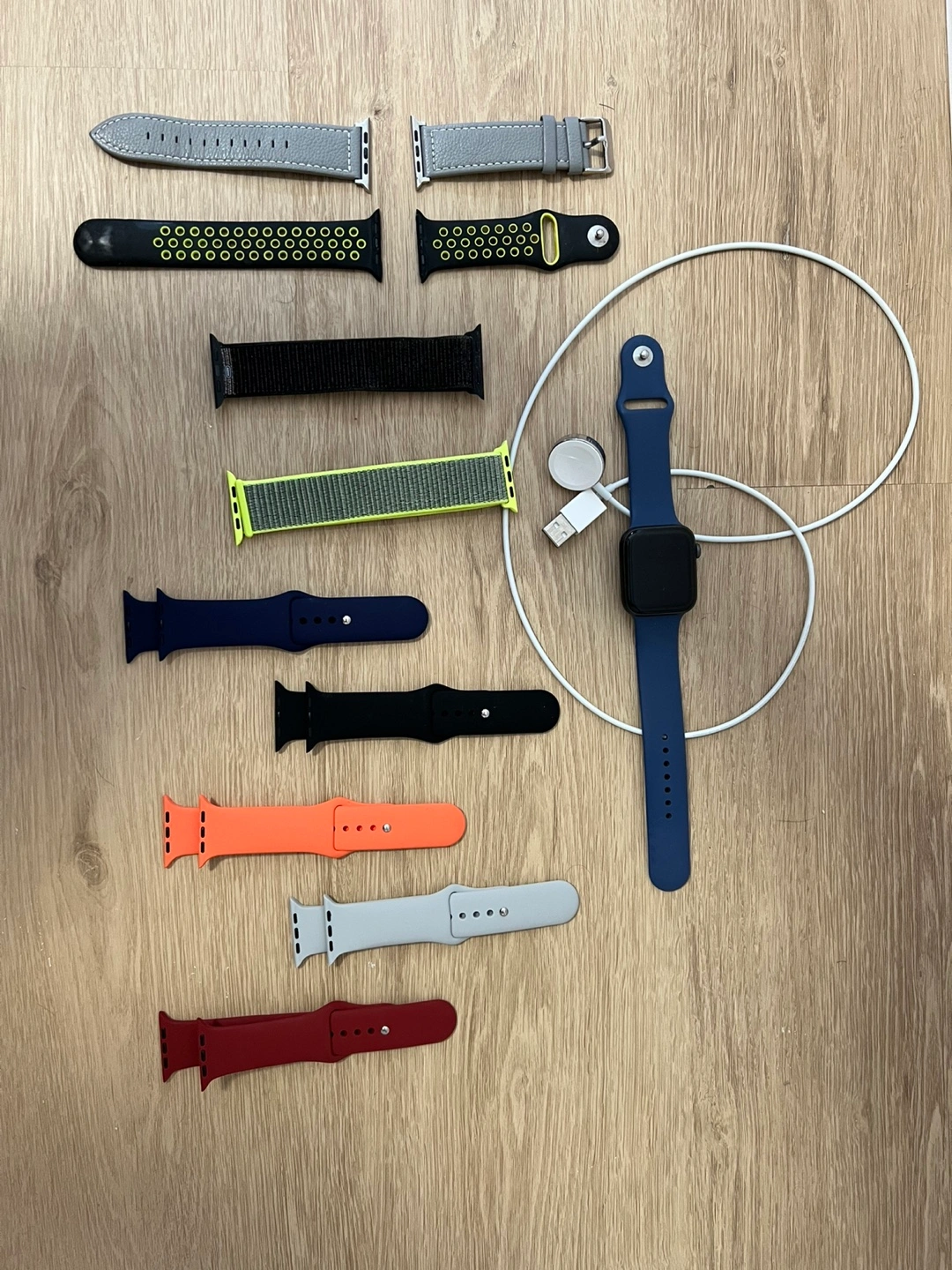 Apple Watch Series 4, space grey aluminum case. 44mm. Excellent quality. Includes 10 different bands: leather, silicone, sport loop, and nylon. Charging cable also included. Pre-owned.