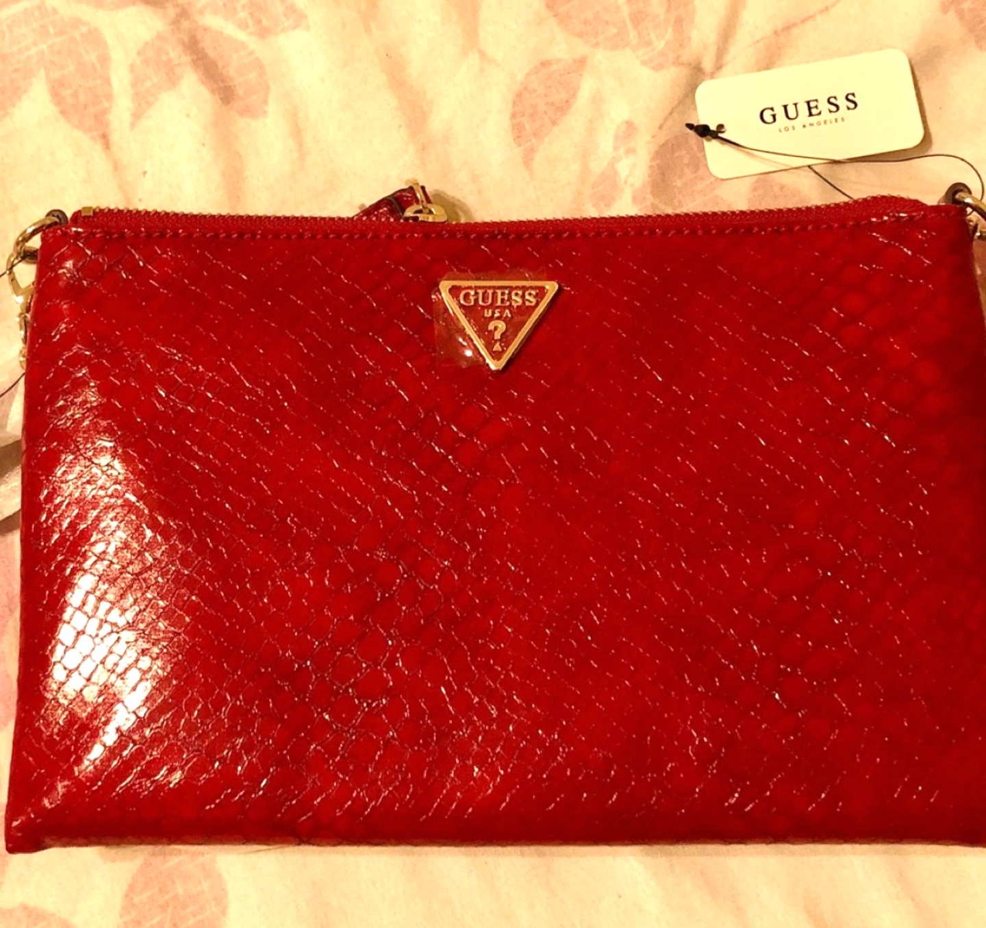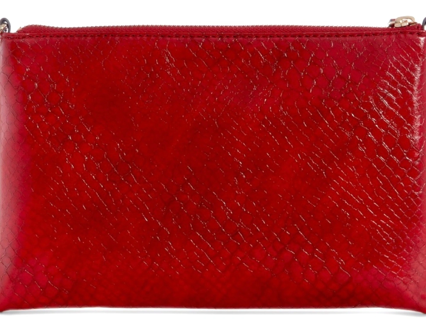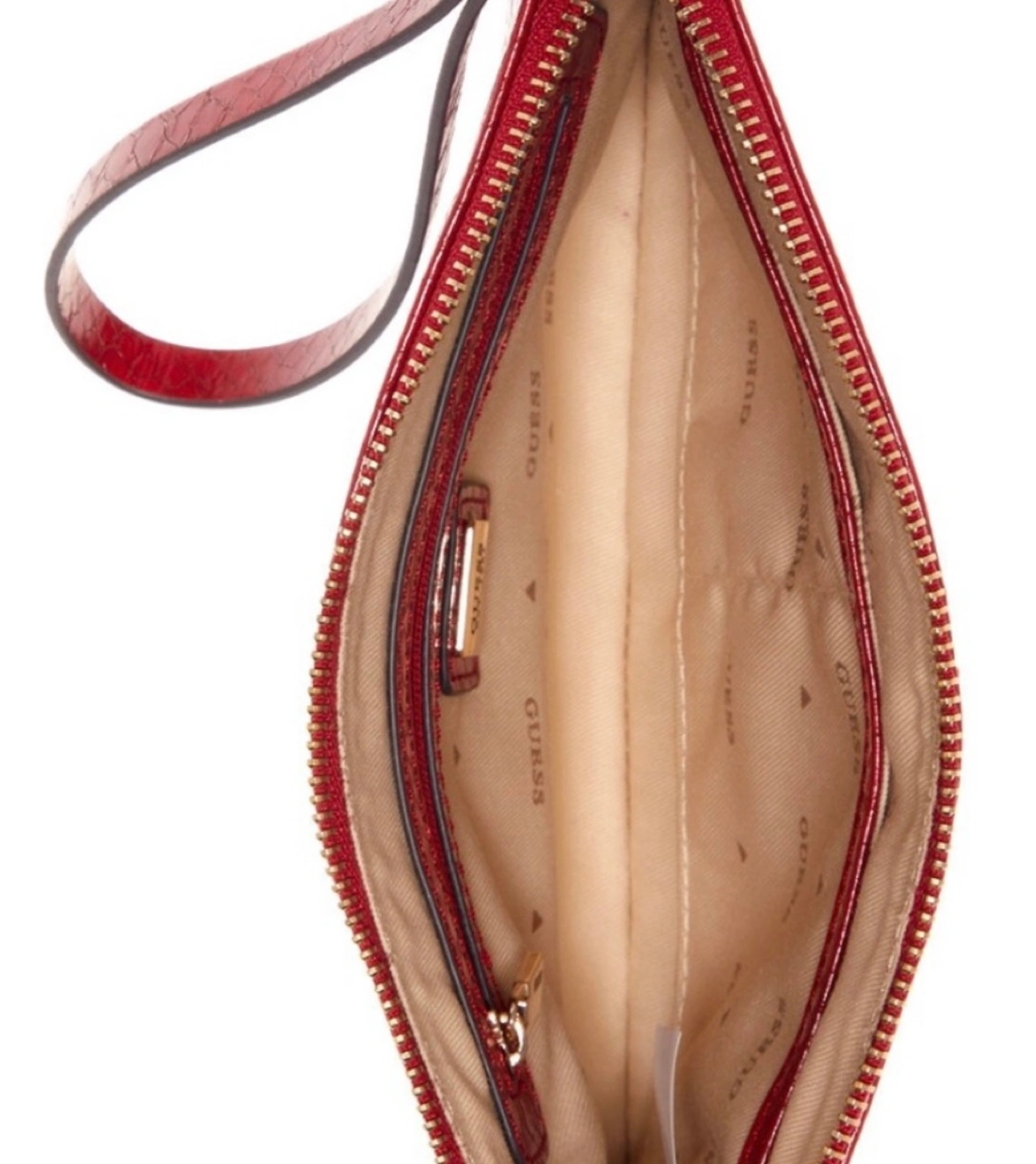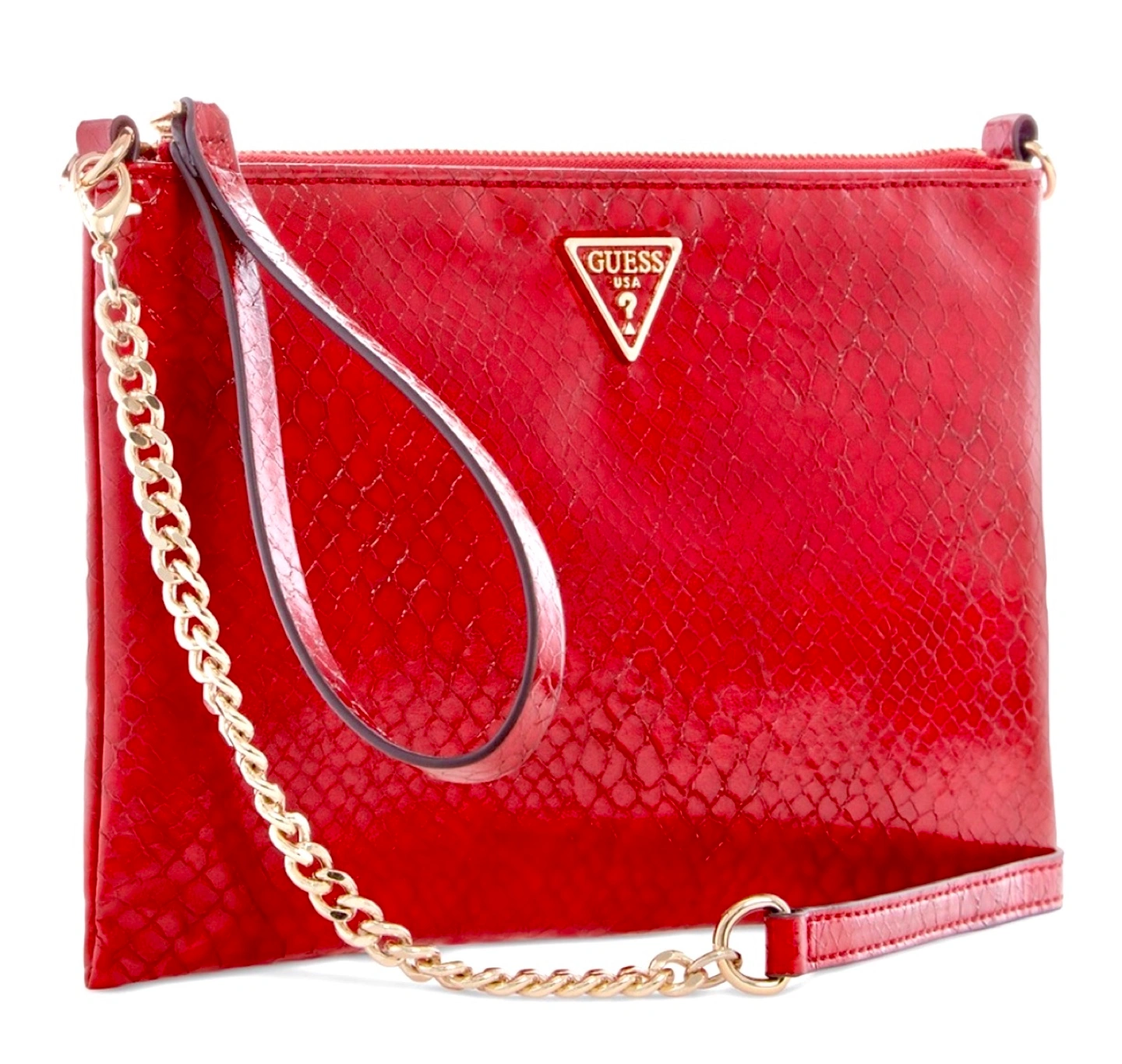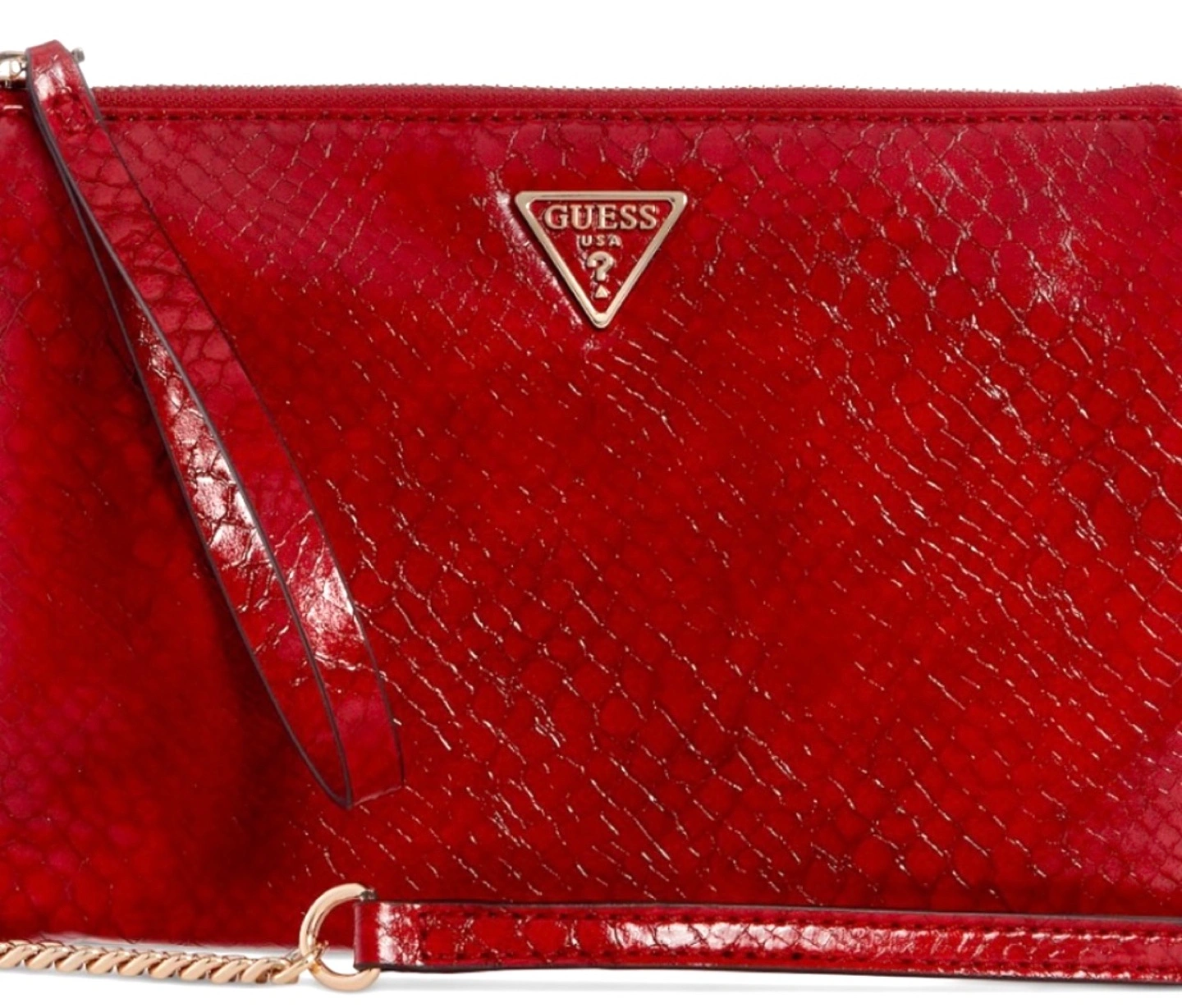 Red snakeskin-embossed Guess clutch. Goldtone hardware. Zip closure. Detachable strap. Interior pockets.