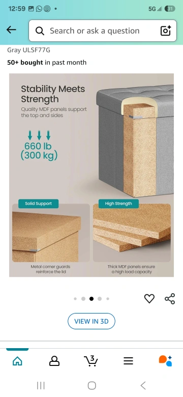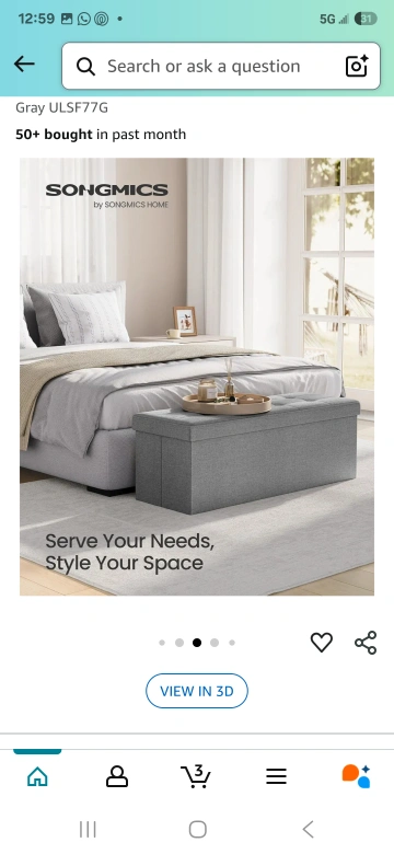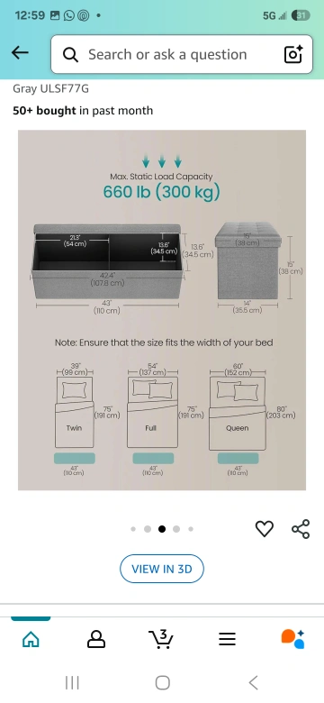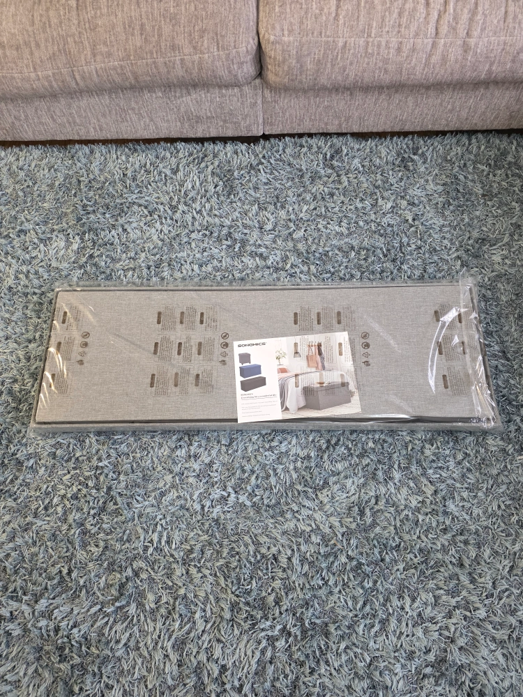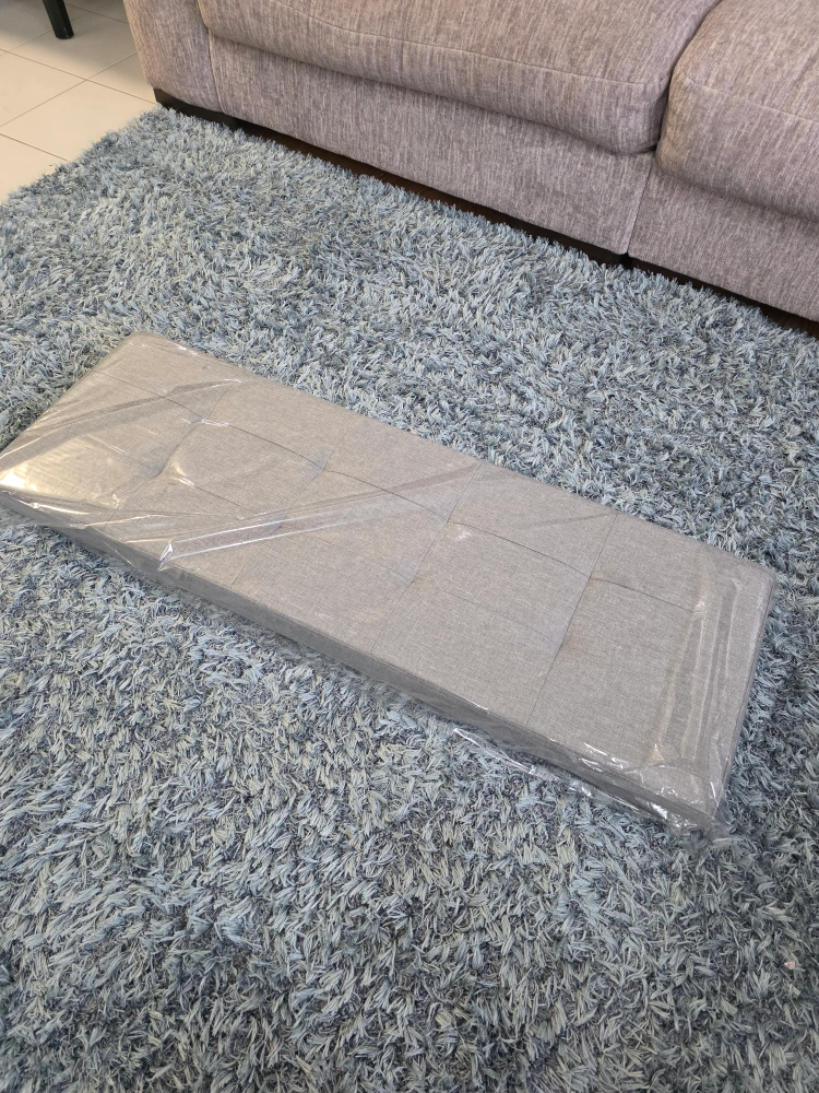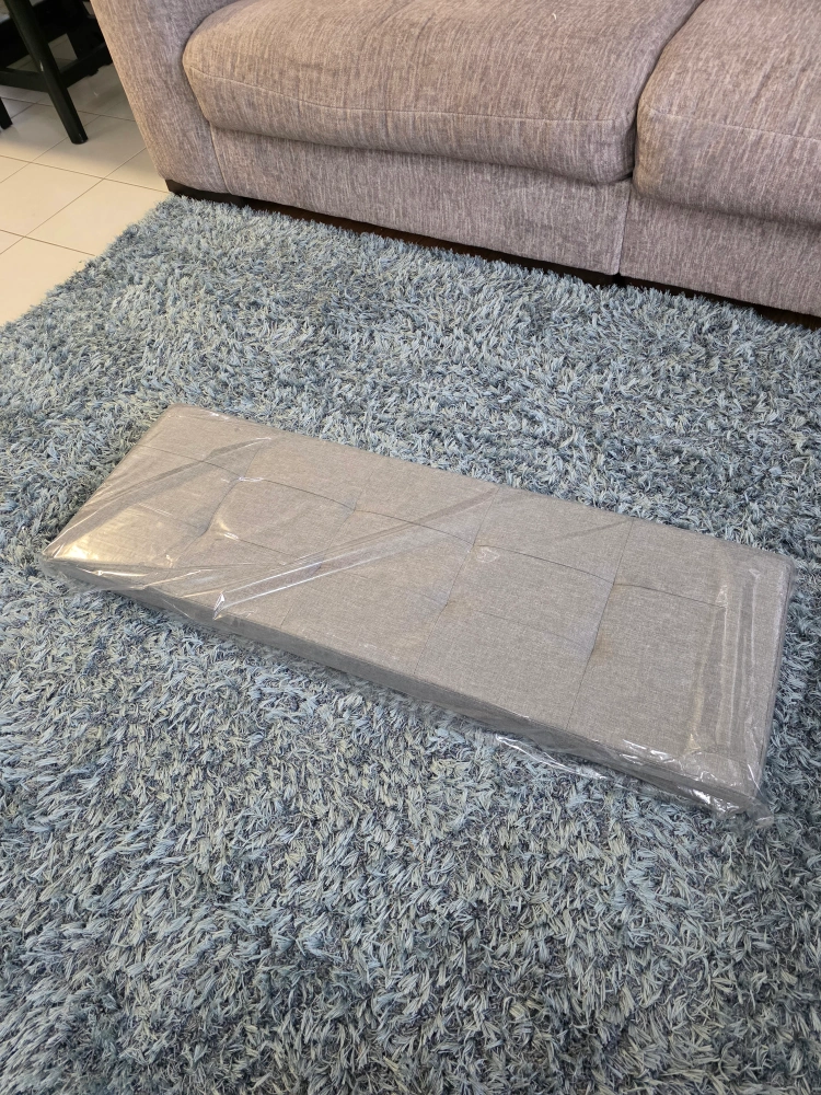 Spacious storage ottoman. Folds for easy storage. Durable fabric. Supports up to 660 lbs. Ideal for living room, bedroom, or entryway. Light gray colour.