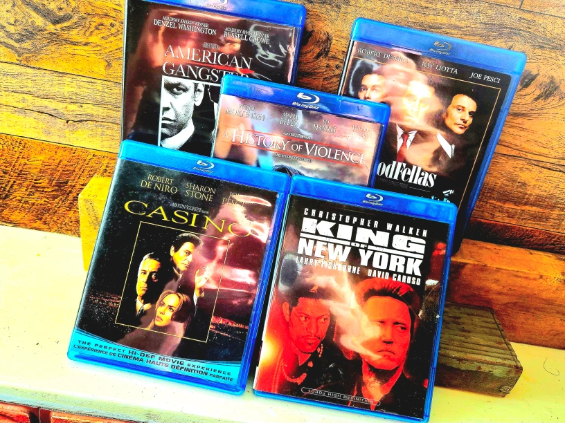 Five classic crime films on Blu-ray. Includes American Gangster, Goodfellas, Casino, A History of Violence, and King of New York. Perfect for movie collectors.