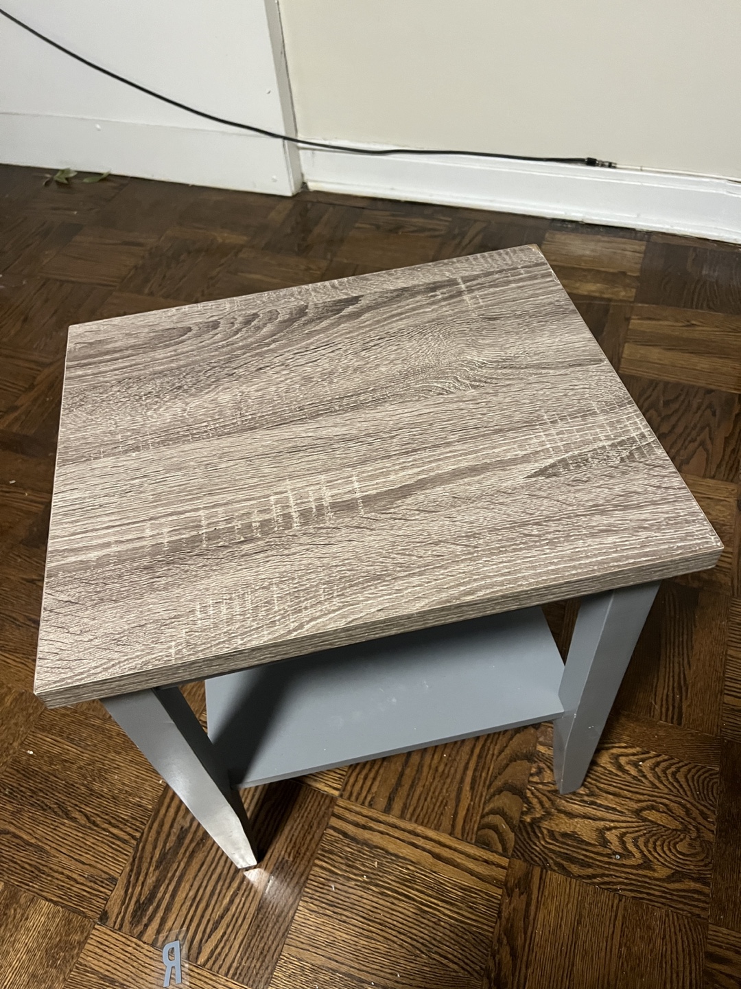 Small end table. Grey legs and shelf. Wood-look top. Good condition. Perfect for a small space.