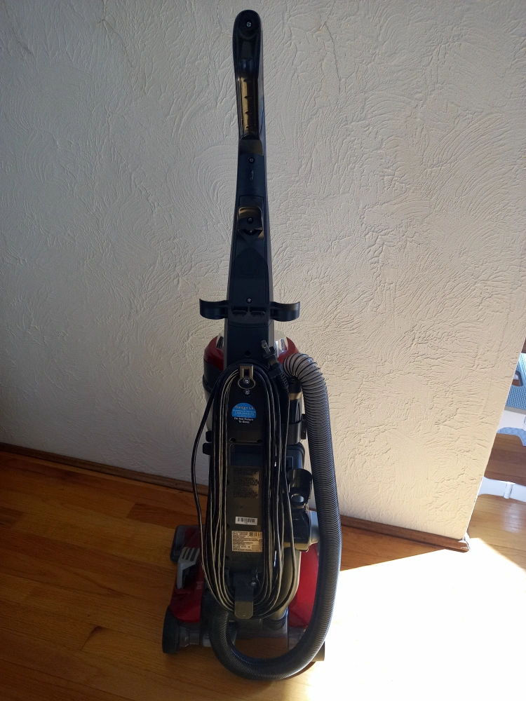 Red upright vacuum cleaner. Features a large dust cup and multiple floor settings. Includes a long cord and various attachments.