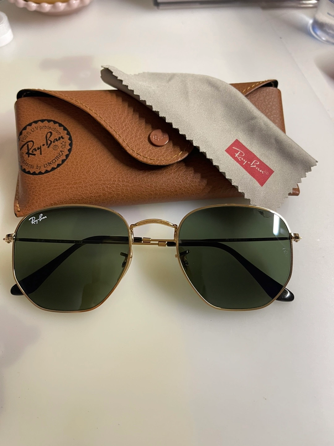 Authentic Ray-Ban Gold-framed hexagonal sunglasses. Includes a brown leather case and cleaning cloth. Ray-Ban branding visible on the arms and case.