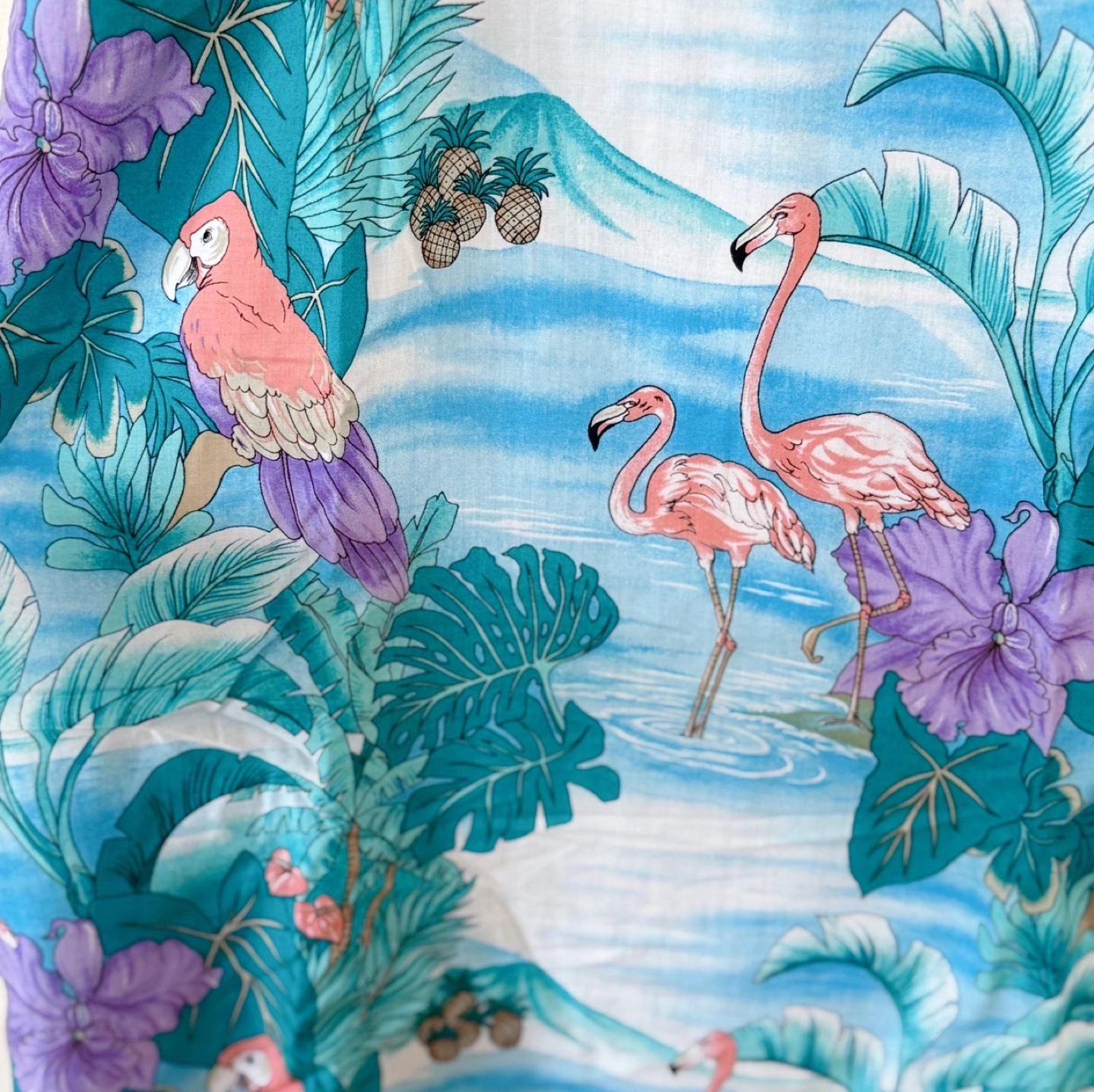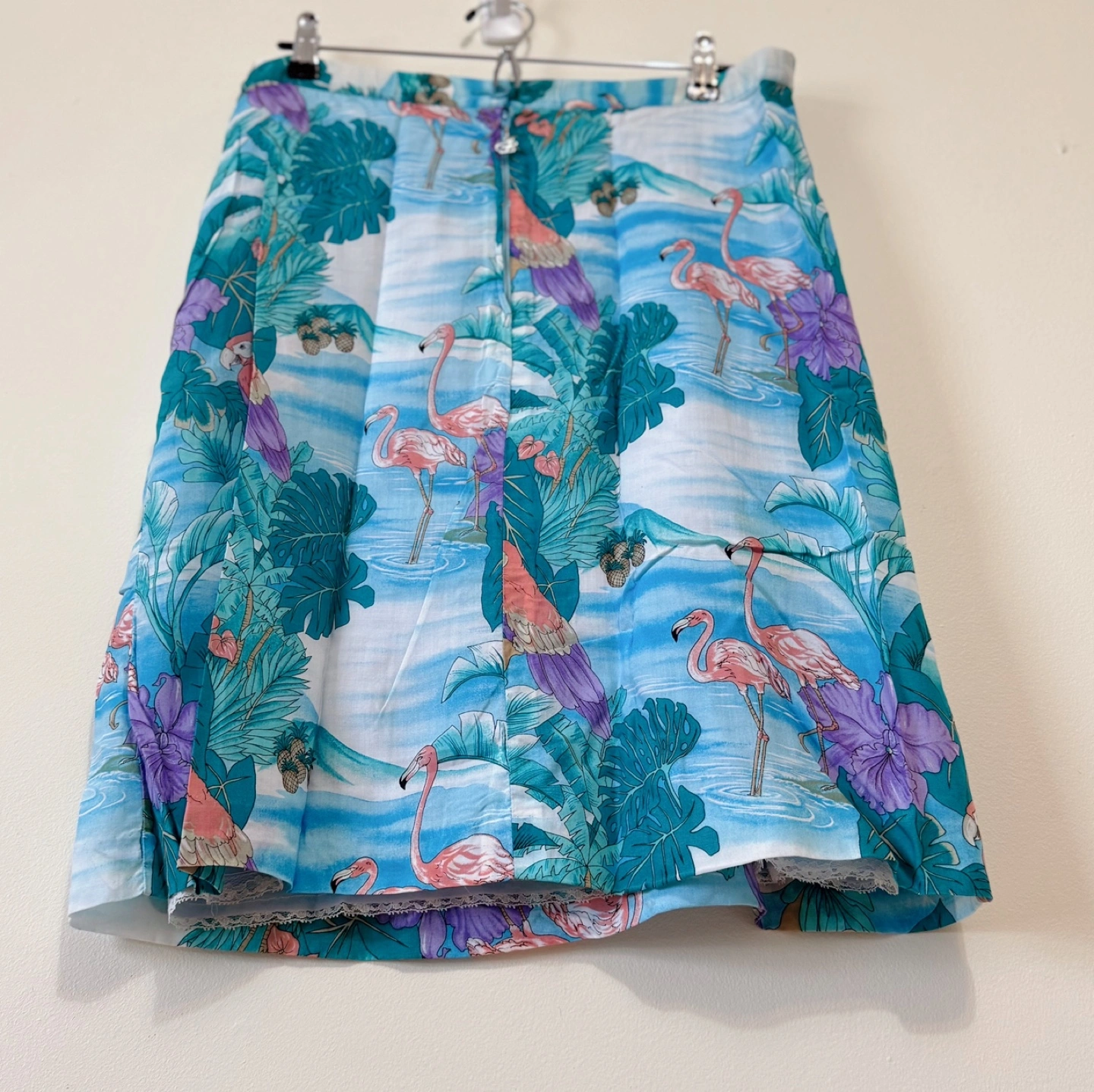 A vibrant vintage skirt featuring a charming tropical print with flamingos, parrots, pineapples, and lush foliage. This eye-catching piece is perfect for summer days, beach outings, or adding playful flair to your wardrobe. The front button closure adds a classic vintage touch, and the skirt is lined for added comfort.