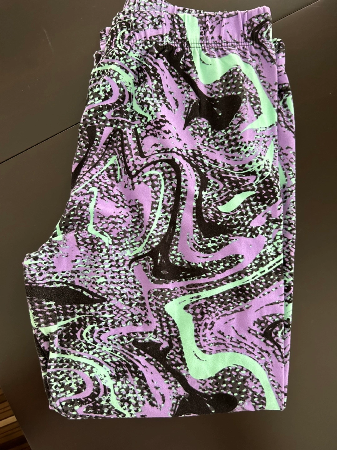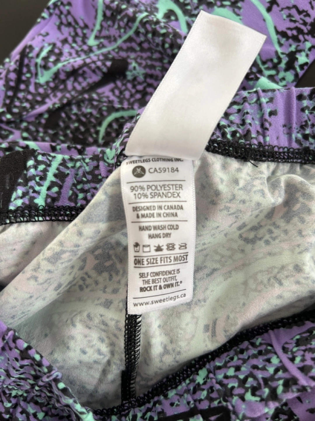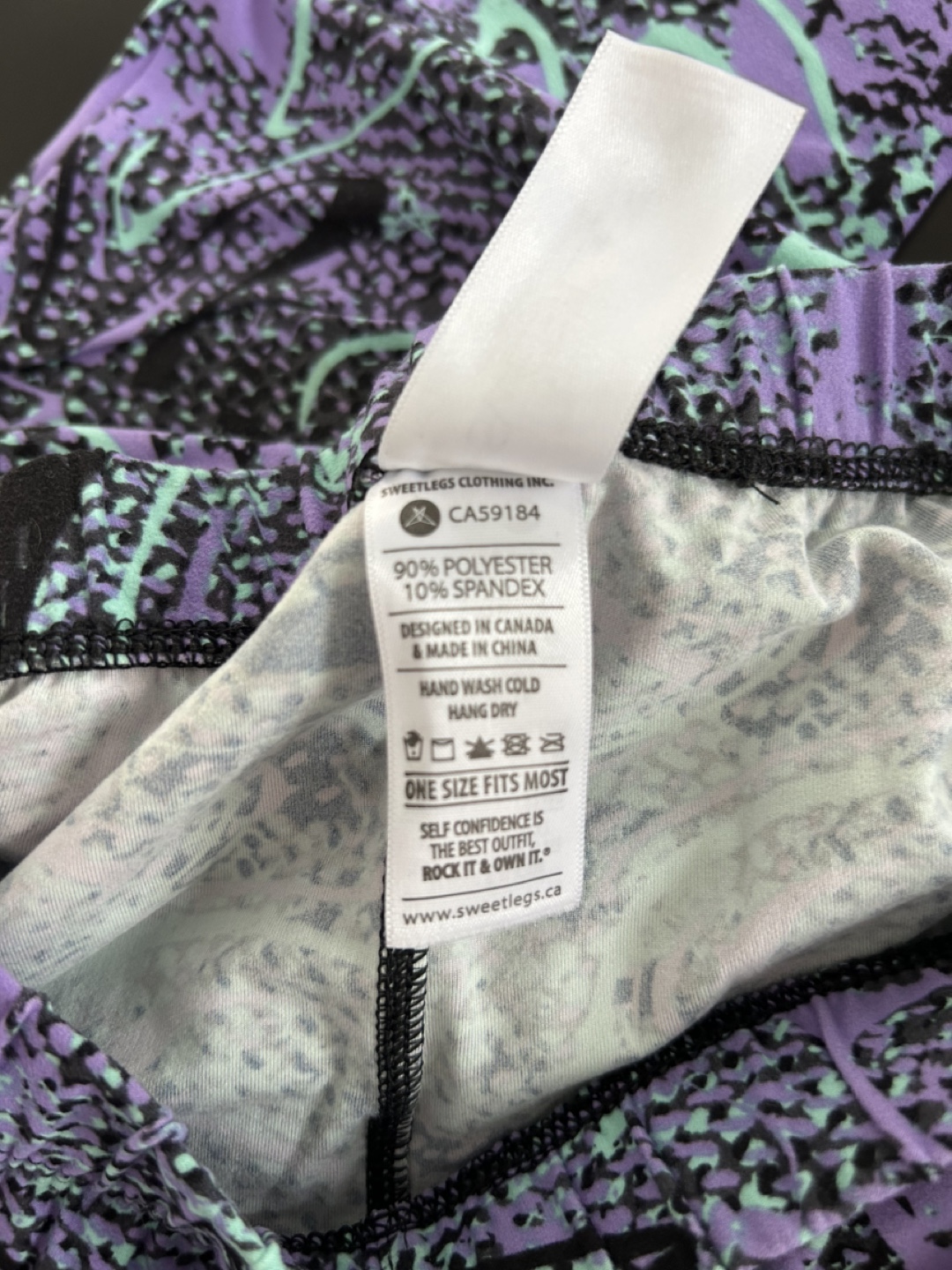 Women's SweetLegs Crops leggings. One size fits most. Purple, green, and black marble print. 90% polyester, 10% spandex.