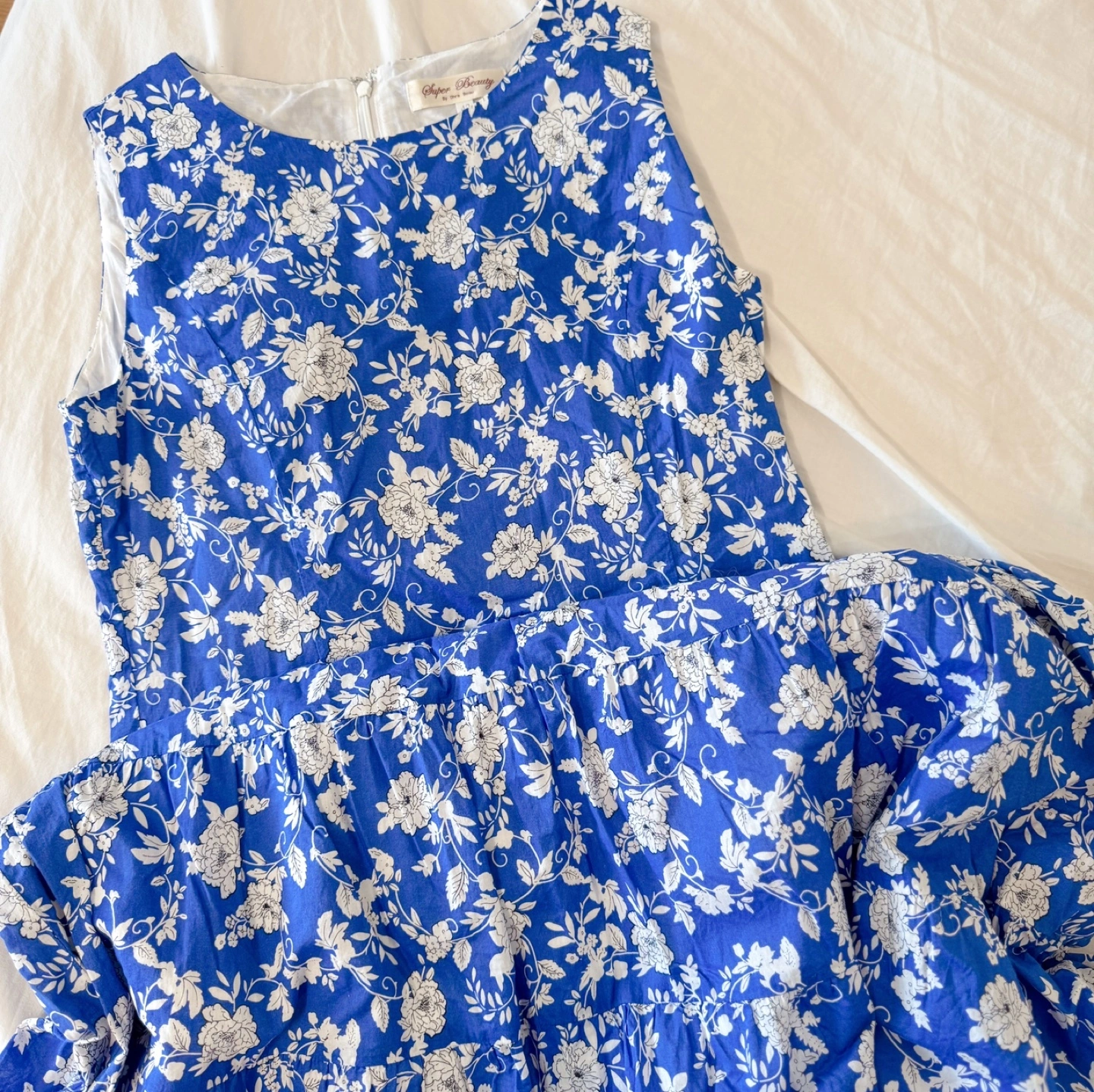 A breezy and feminine vintage sleeveless dress featuring an all-over floral print. This cotton maxi dress has a softly gathered tiered skirt for beautiful movement and volume. Fully lined and ideal for warm weather, it’s the perfect piece for picnics, vacations, or casual summer days.