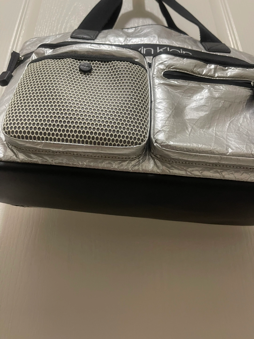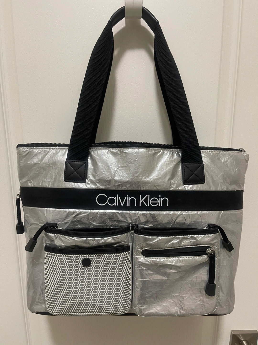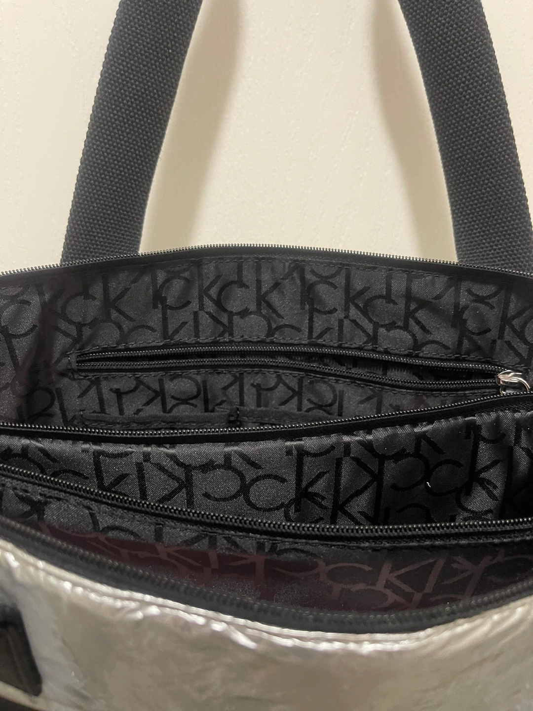 ***ADDED GIFTS*** PLUS REDUCED*** Silver metallic tote bag. Features black straps and accents. Multiple zippered pockets inside and outside with one mesh pocket. Great for a travel tote or for everyday use. SUPER buy - other Calvin Klein tote bags with no compartments are $100-200 SIZE - 12”x 18”x 6” - SUPER NEAT & VERY ORIGINAL ***ADDED GIFTS to carry in purse - Narciso Rodriguez travel size pressed perfume compact and travel size lotion***