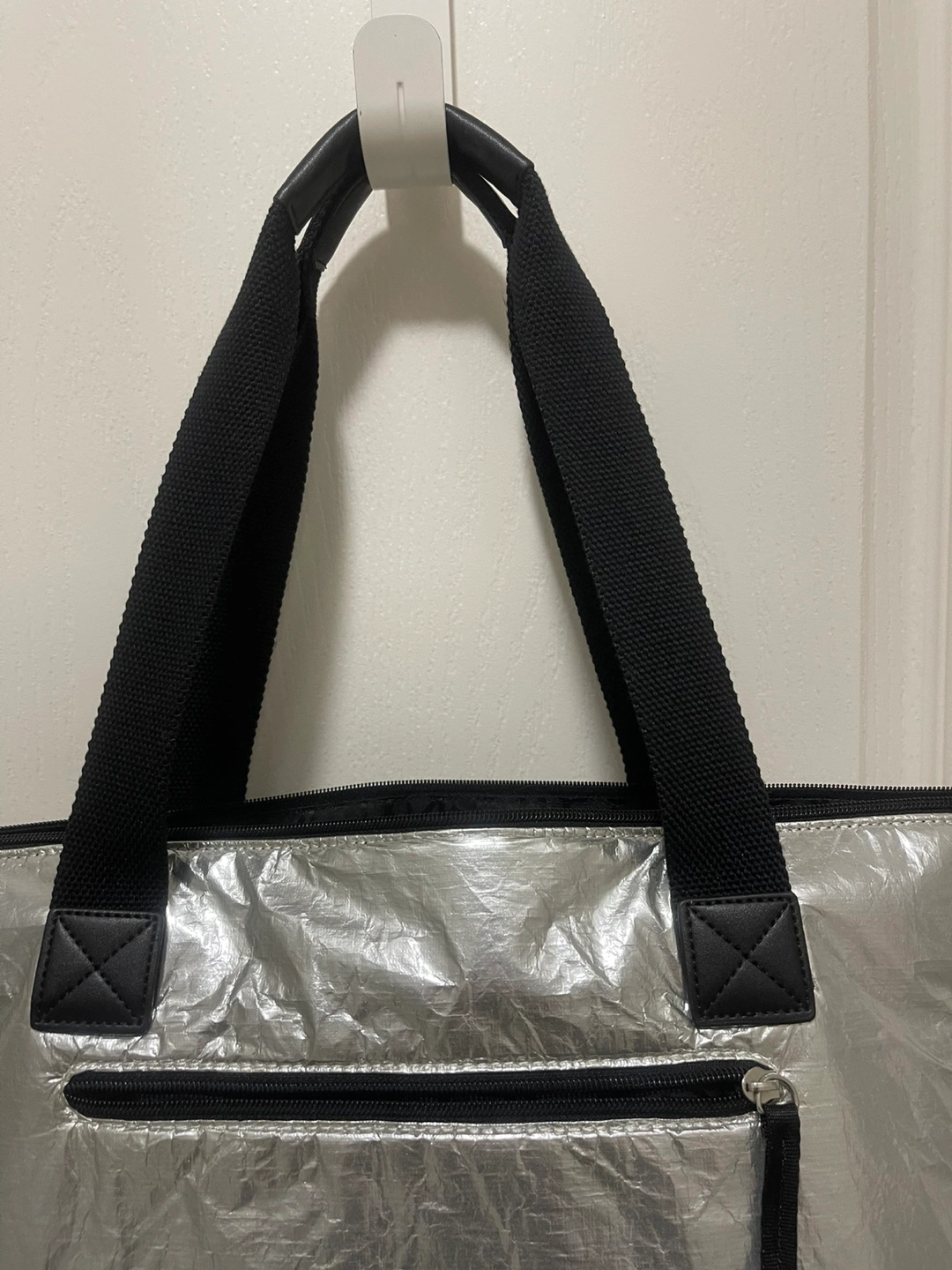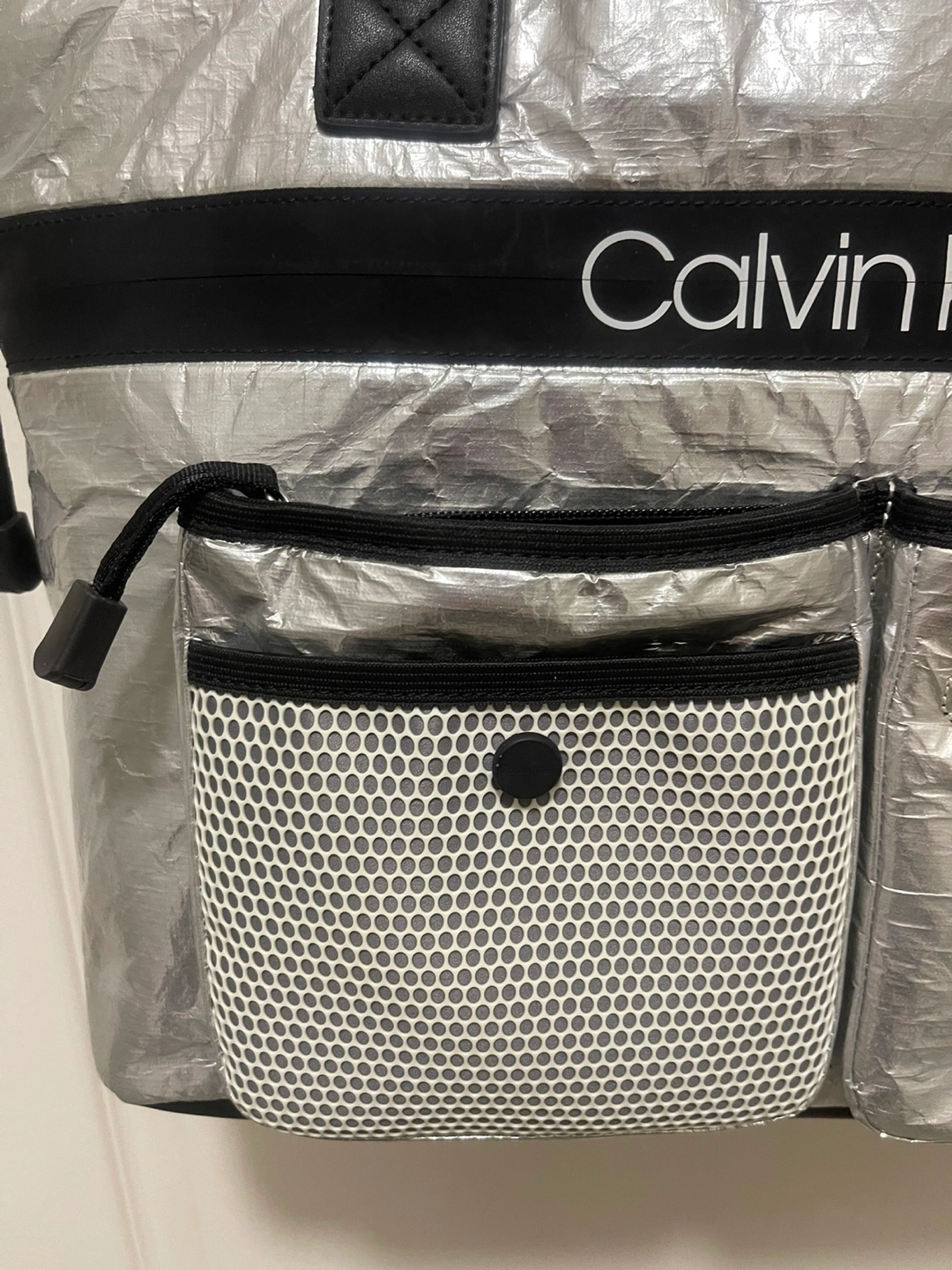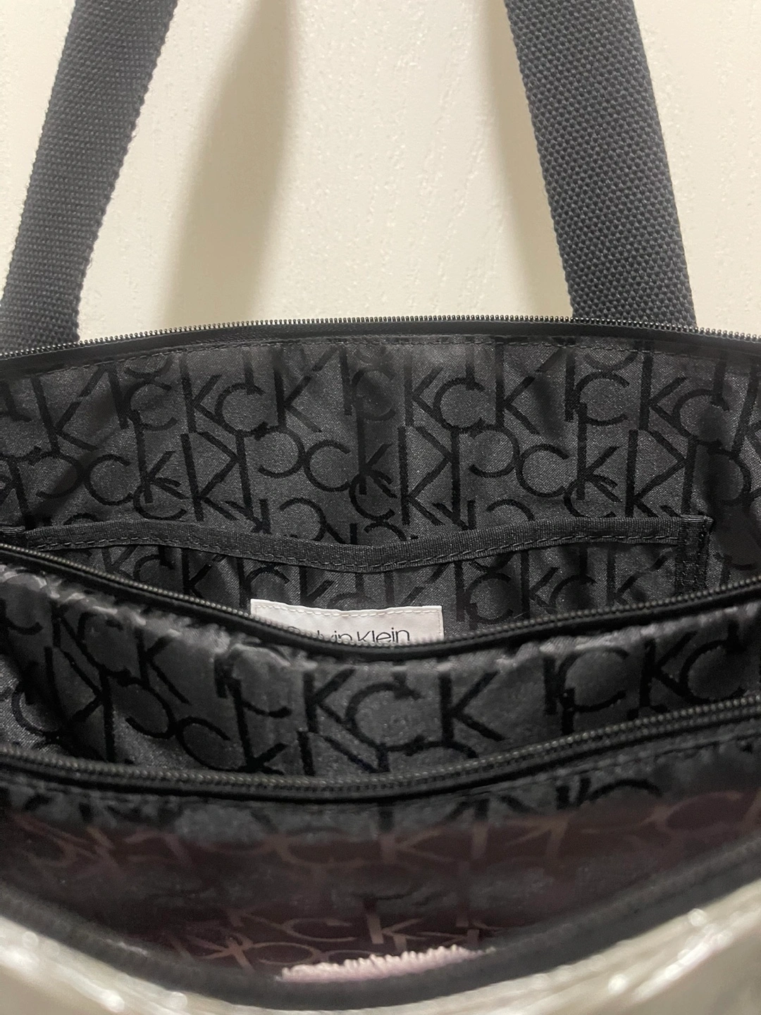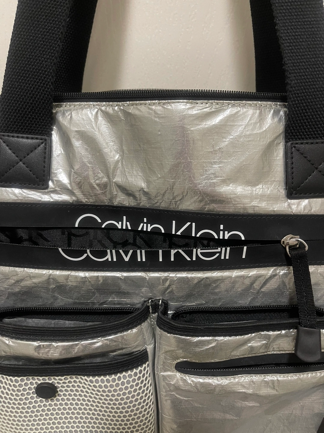 ***ADDED GIFTS*** PLUS REDUCED*** Silver metallic tote bag. Features black straps and accents. Multiple zippered pockets inside and outside with one mesh pocket. Great for a travel tote or for everyday use. SUPER buy - other Calvin Klein tote bags with no compartments are $100-200 SIZE - 12”x 18”x 6” - SUPER NEAT & VERY ORIGINAL ***ADDED GIFTS to carry in purse - Narciso Rodriguez travel size pressed perfume compact and travel size lotion***