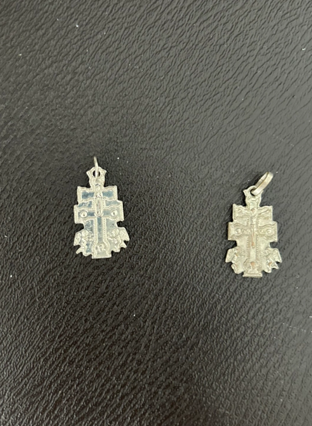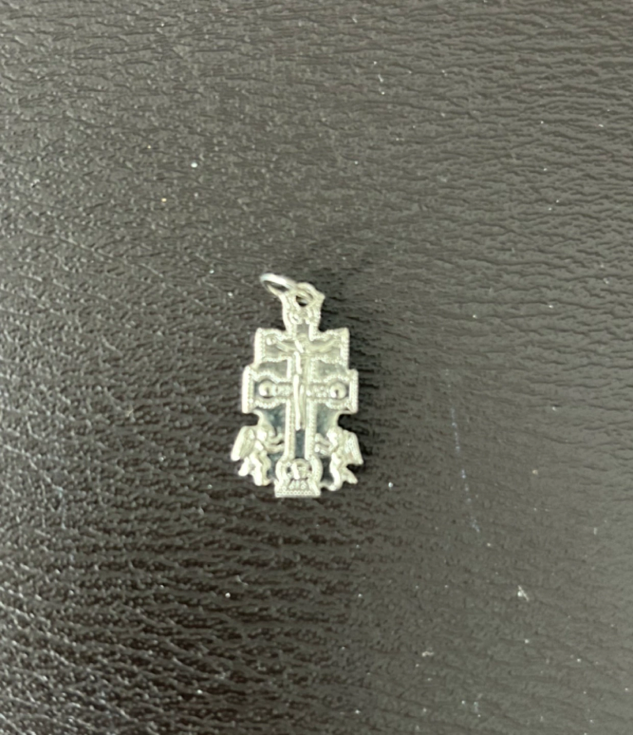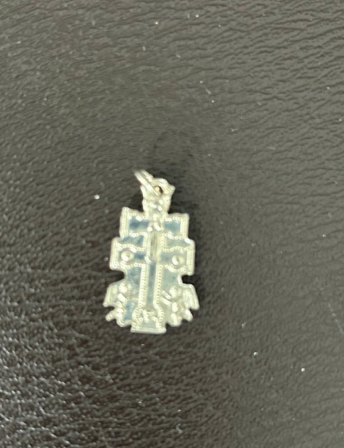 2 Small silver-tone metal charm pendant. Features an ornate cross design. Includes a bail for easy attachment to a necklace or chain. Approximately 1 inch in length.