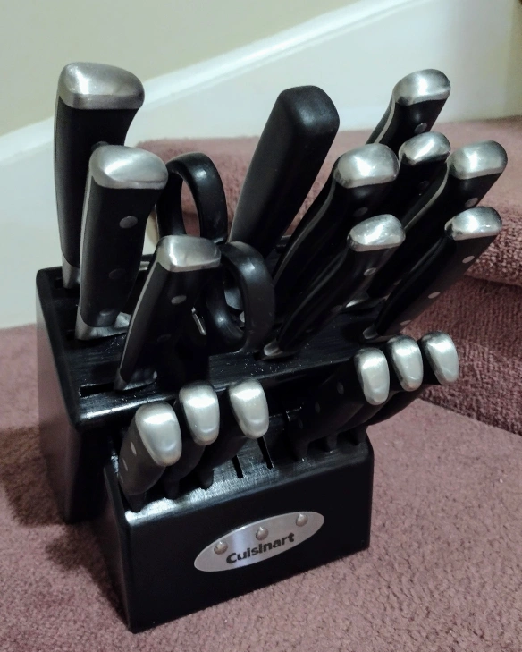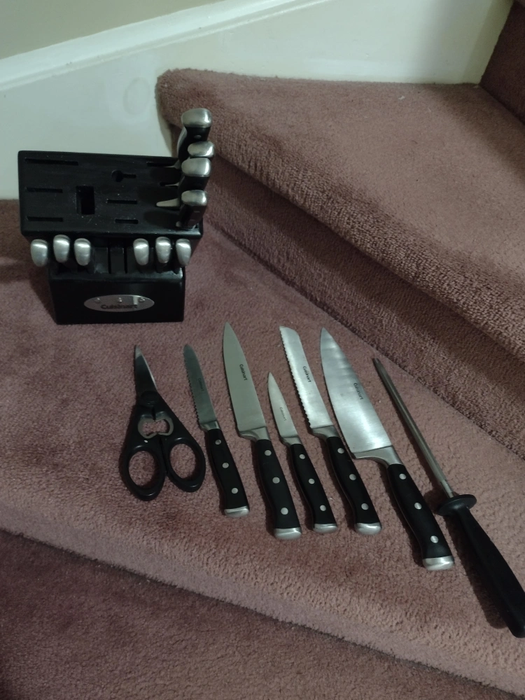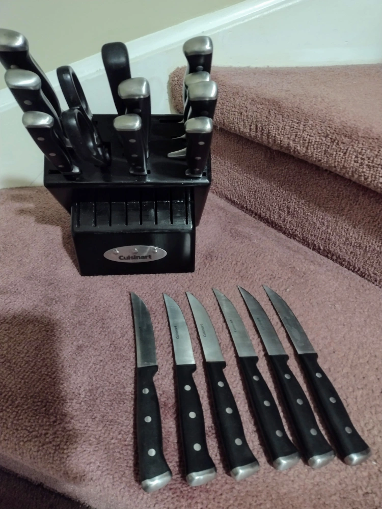 Stainless steel knives with black handles. Includes a knife block and kitchen shears. Several steak knives included.