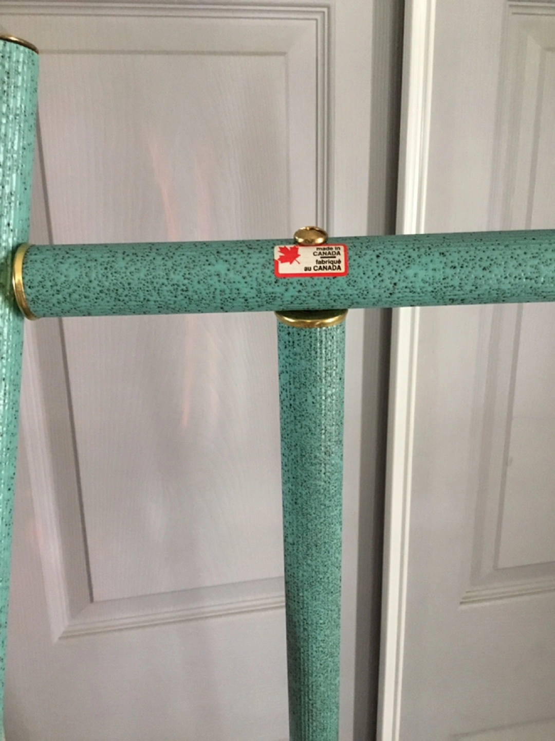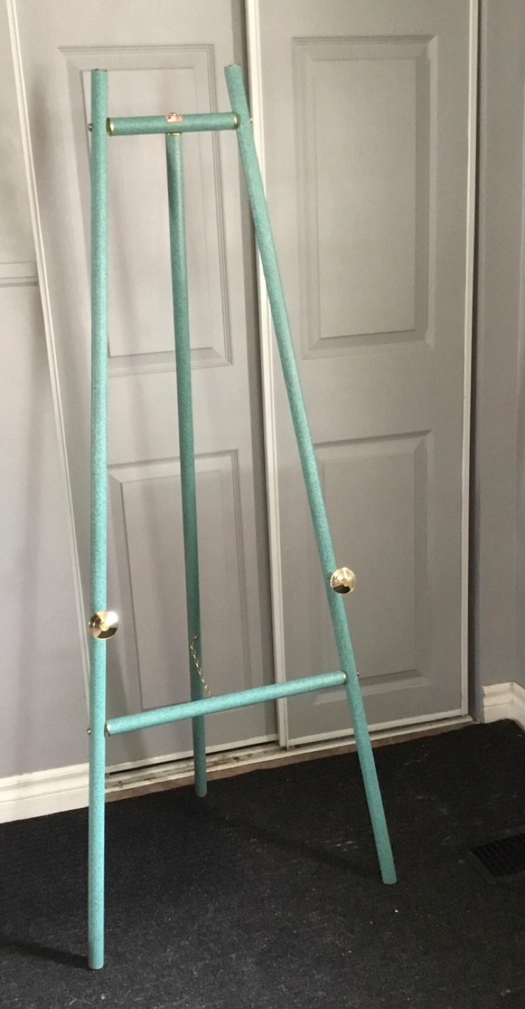 Unique vintage easel. Light teal colour. Brass accents. Made in Canada. Great for displaying artwork or photos.