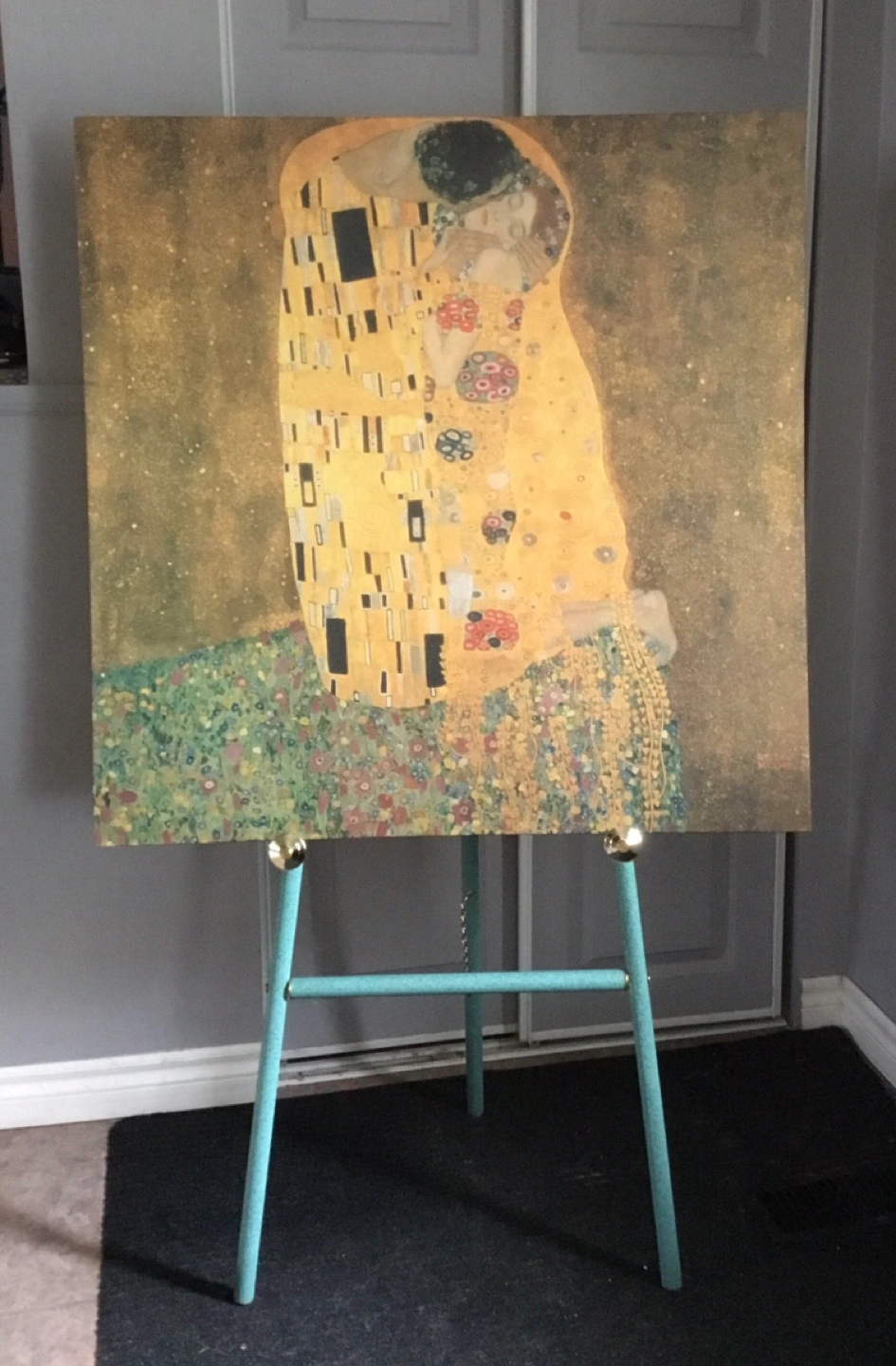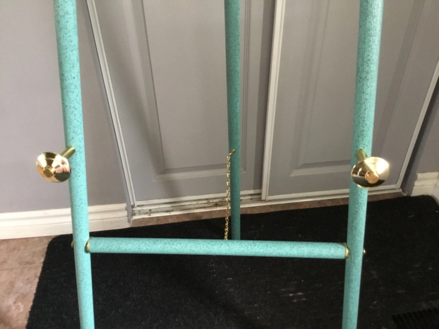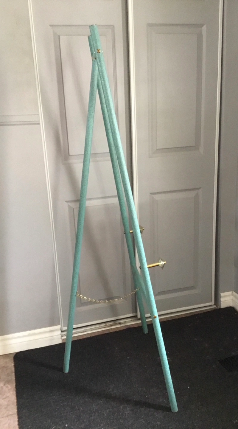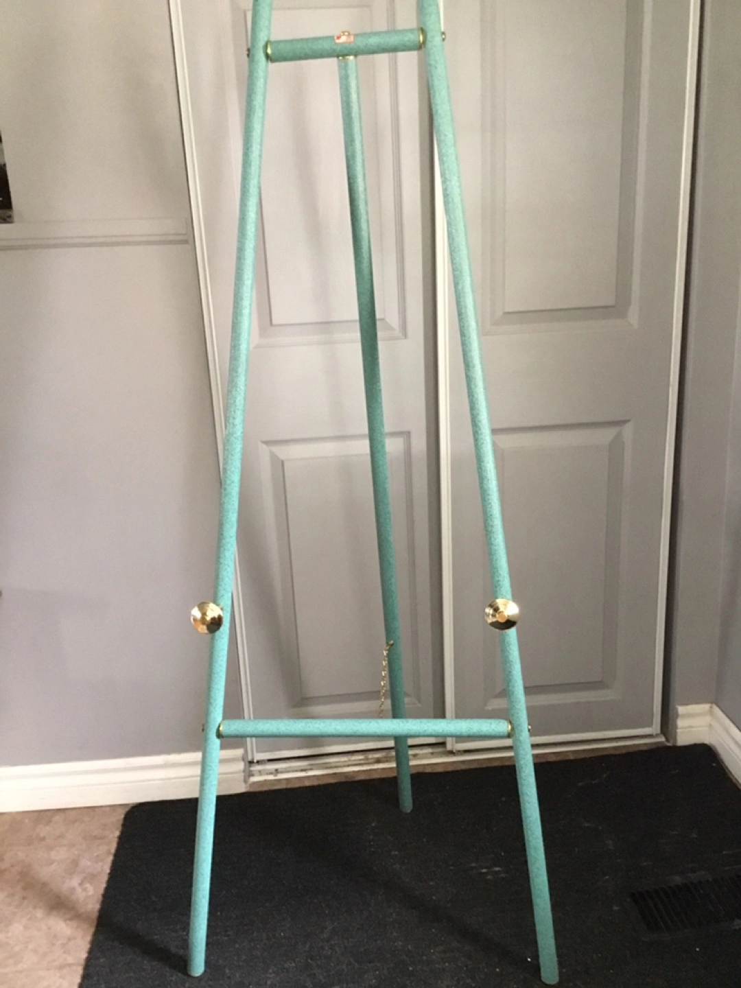 Unique vintage easel. Light teal colour. Brass accents. Made in Canada. Great for displaying artwork or photos.