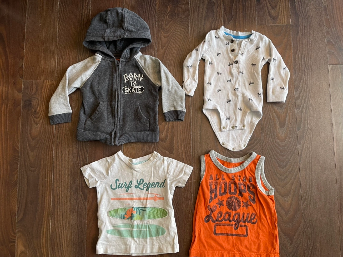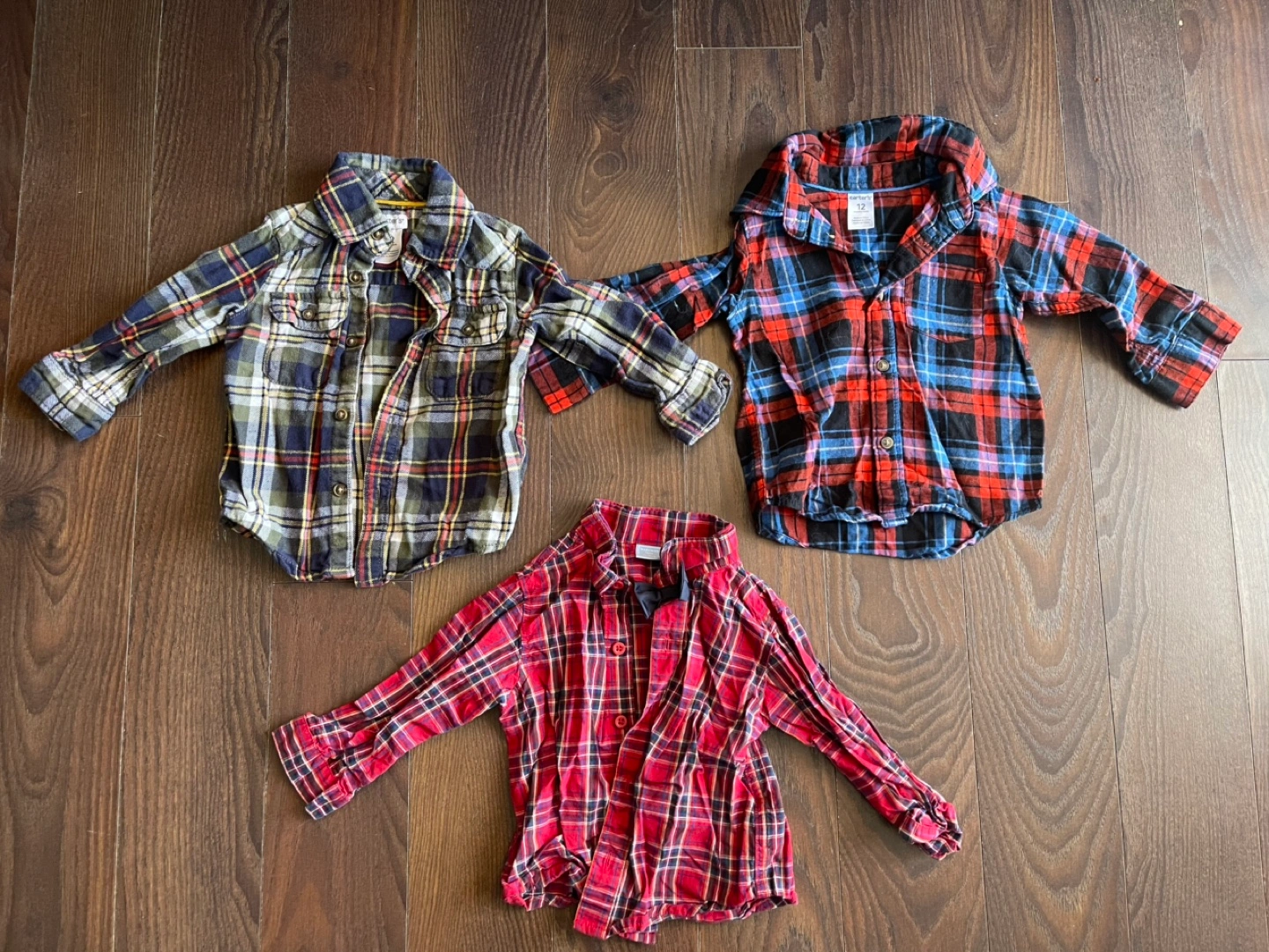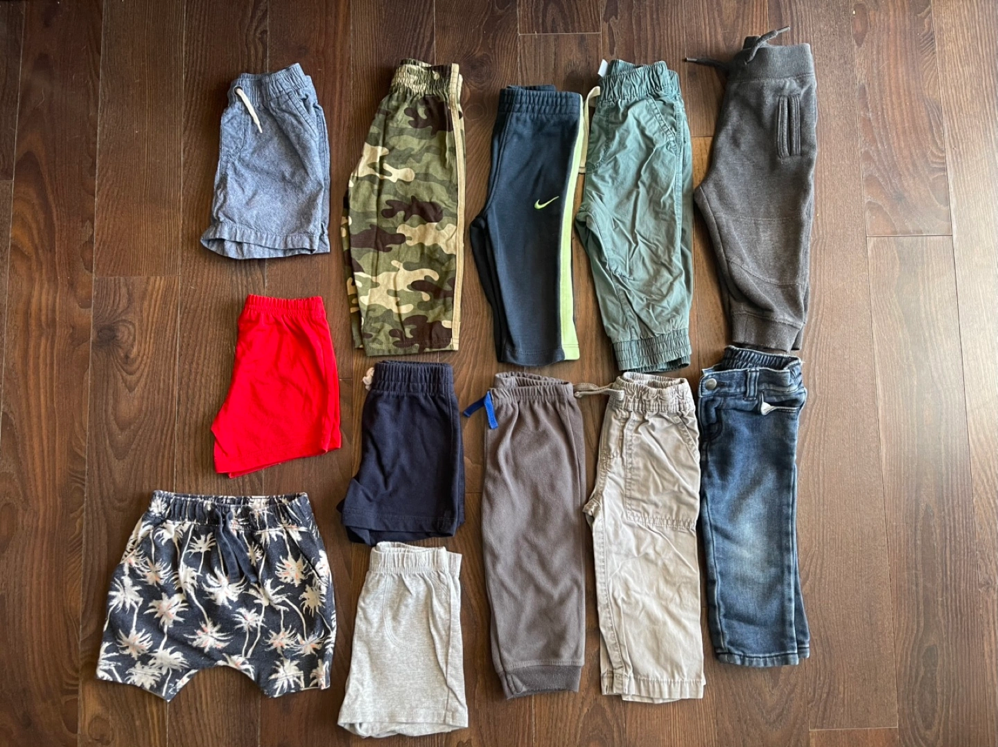 Large bundle of baby boy clothes. Includes three plaid shirts, twelve pairs of shorts in various colours and patterns, one hooded sweatshirt, one long-sleeve onesie, one t-shirt, and one tank top. Sizes 18-24 months.