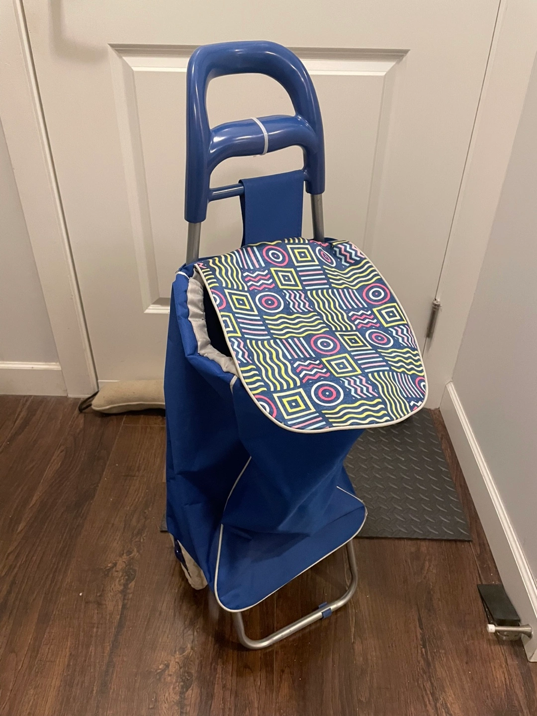 Portable shopping cart, foldable design. Blue fabric with geometric pattern. Features a handle and wheels. Small zippered pocket on the back.