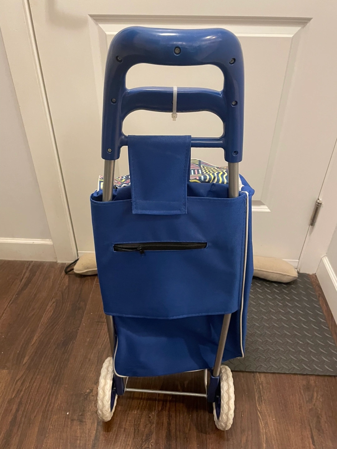 Portable shopping cart, foldable design. Blue fabric with geometric pattern. Features a handle and wheels. Small zippered pocket on the back.