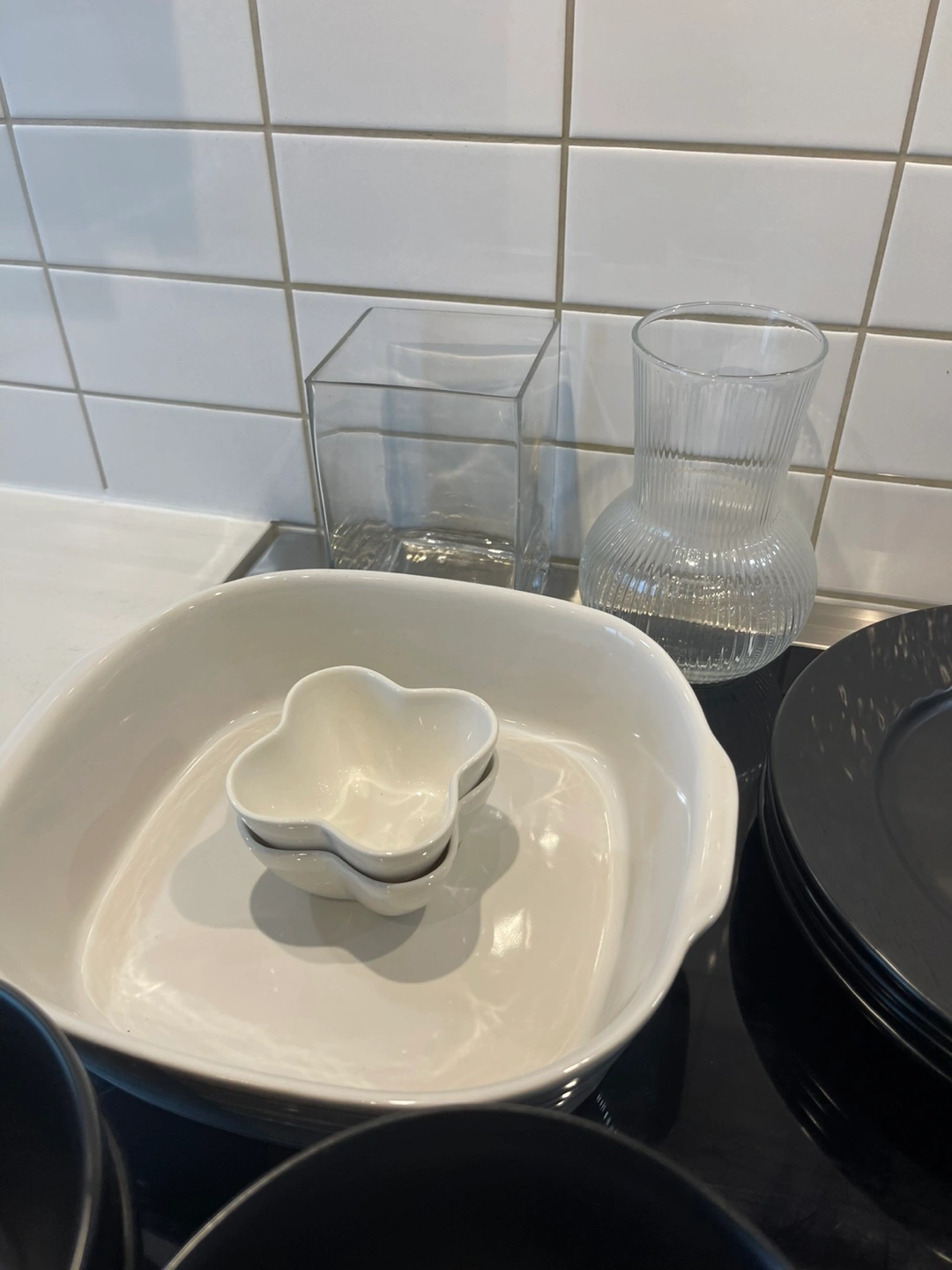 Modern kitchenware bundle. Includes black bowls and plates, a white baking dish with small bowls, and clear glass vases. Perfect for everyday use or entertaining.