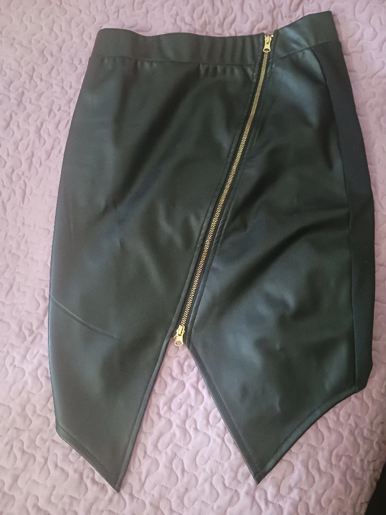 Stylish black mini skirt. Features asymmetrical hemline and a gold zipper detail. Faux leather material (front), thick stretchy fabric (back) provides shape without the squeeze 😉 . Transitions well from Day Into Night.