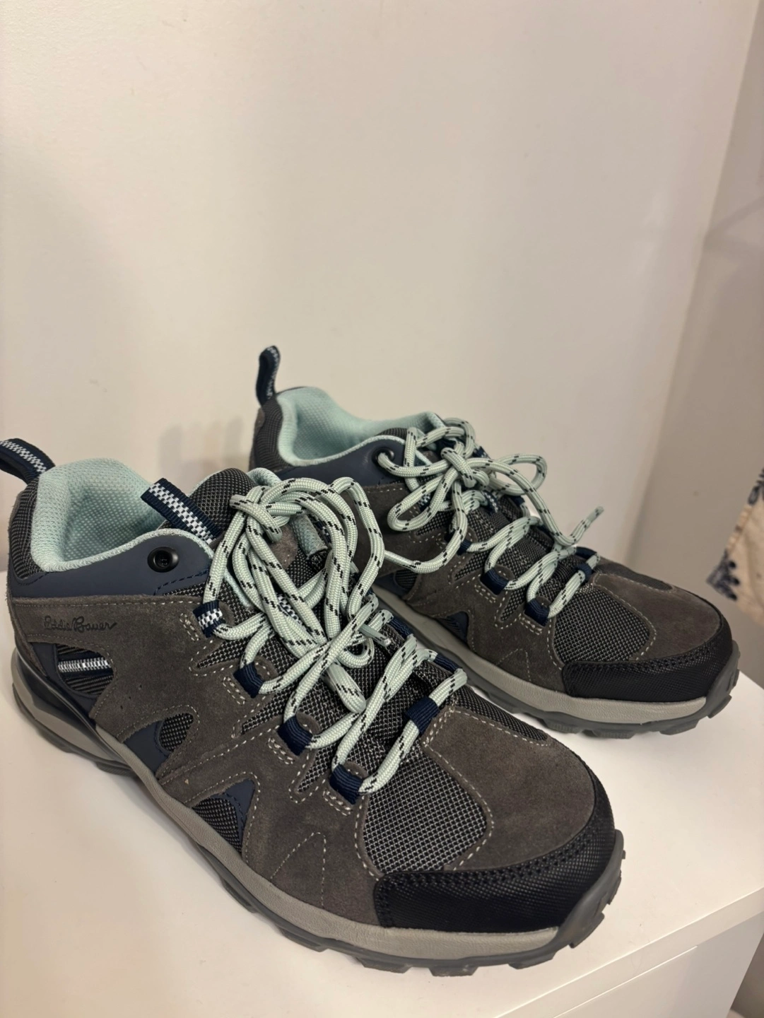Women's size 7 Eddie Bauer hiking shoes. Grey suede and mesh upper. Light blue accents.