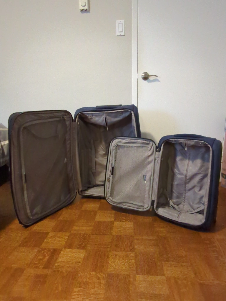 Set of two navy rolling suitcases. Larger suitcase features multiple compartments and organizational pockets. Smaller suitcase ideal for carry-on. Both suitcases have retractable handles and wheels.