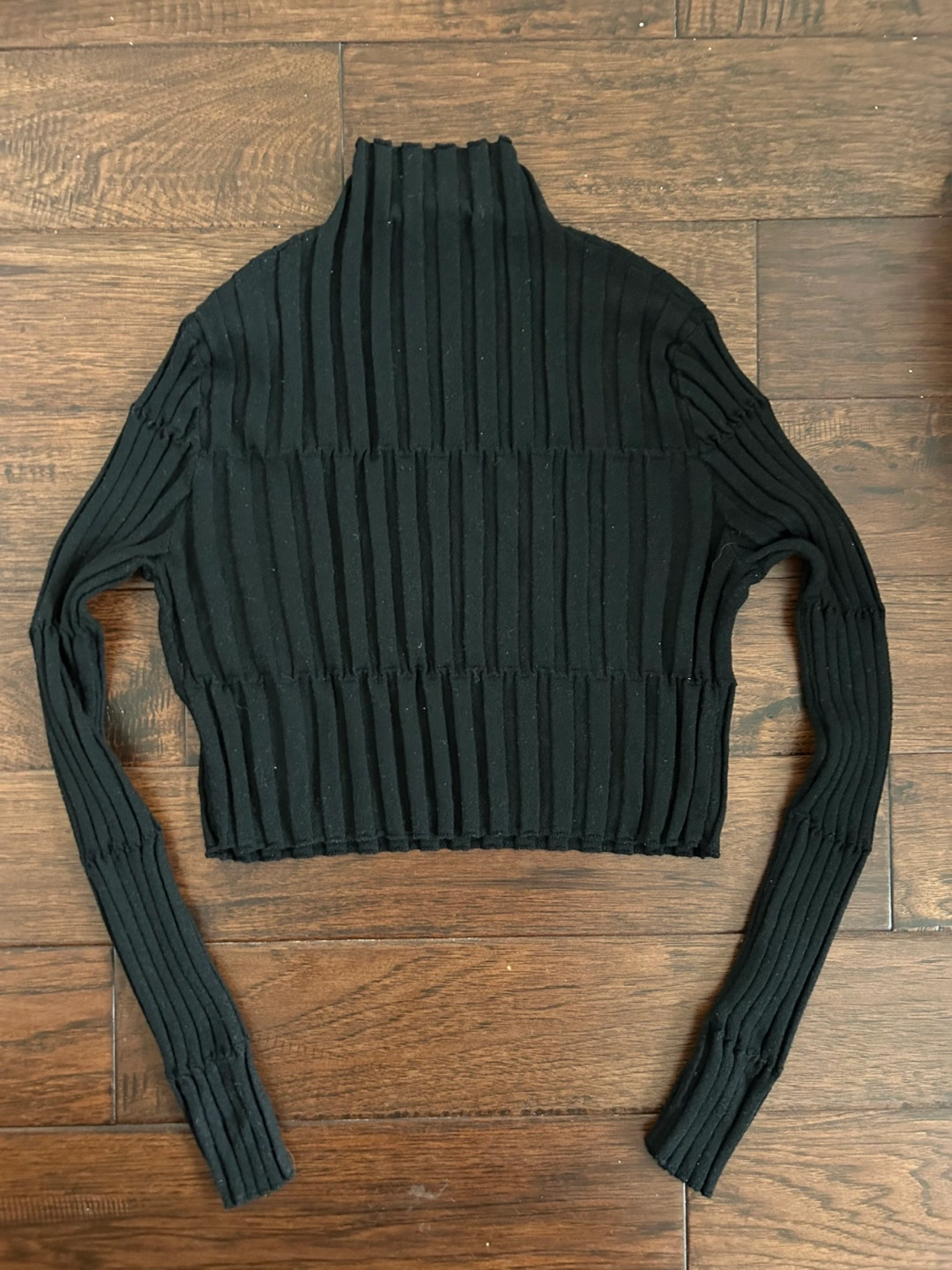 Black ribbed knit cropped long sleeve shirt with a mock neck. Size medium.