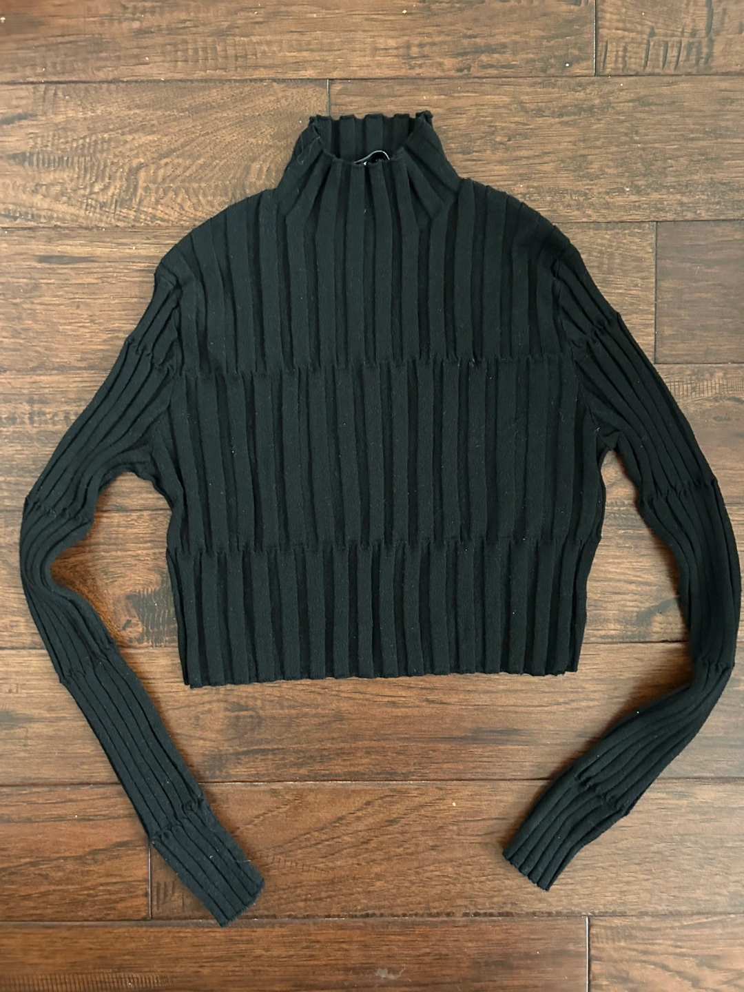 Black ribbed knit cropped long sleeve shirt with a mock neck. Size medium.