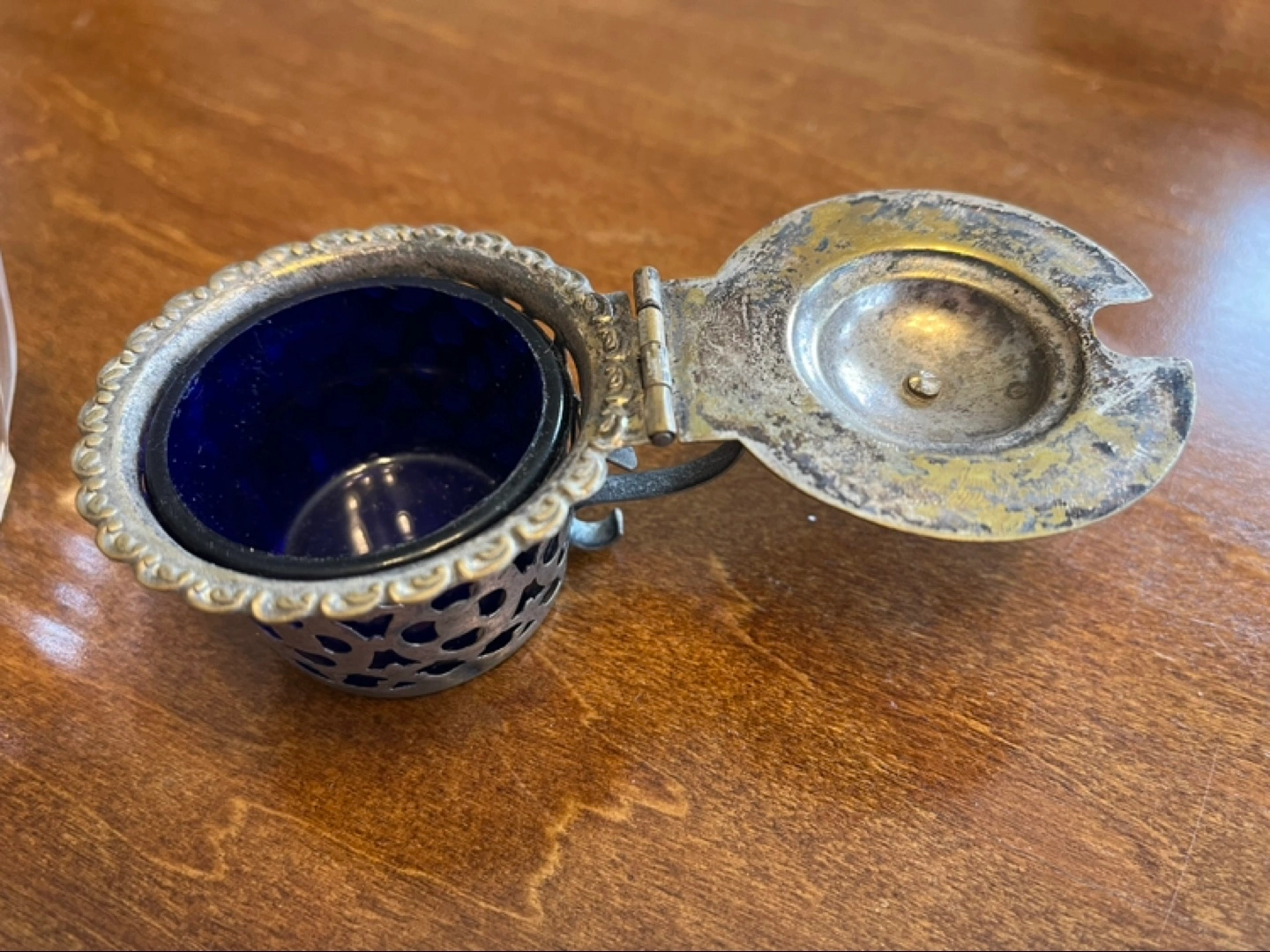 3 antique collectible “salters”, “salt bowls” or “salt cellars”. Used to individually serve salt. One is Silver plated (much is worn off) ornately detailed with lid and Cobalt blue Glass Insert, which is removable and shown separately in one photo.