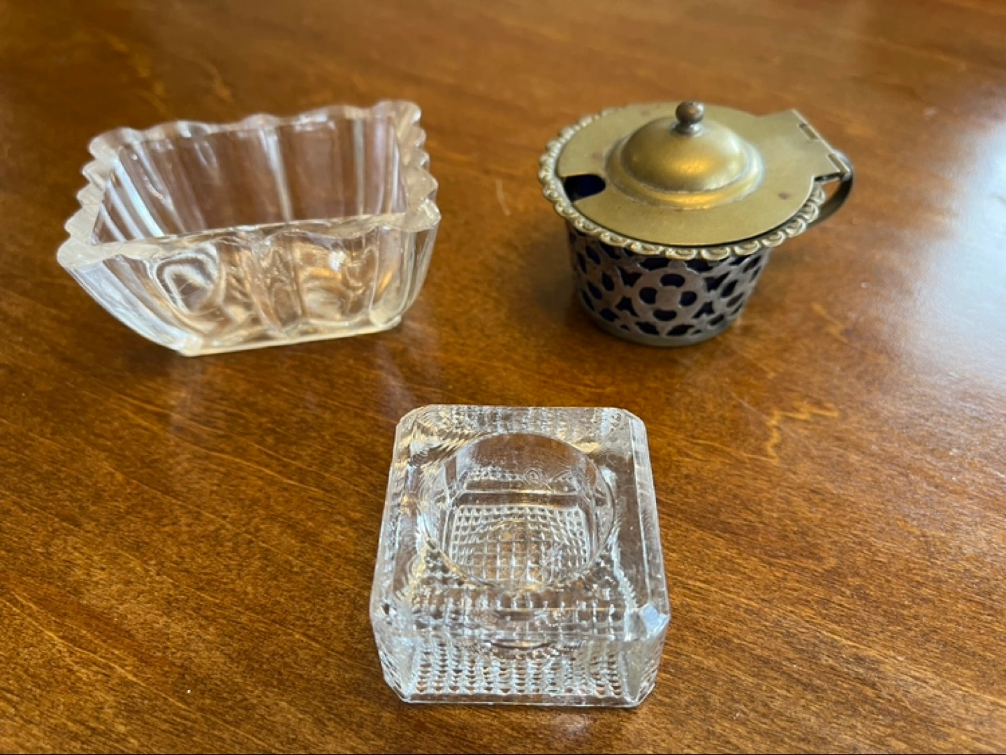 One is a square textured salt cellar and one a bit larger rectangular glass with fluted design. One spoon included. Perfect for a collector or for adding a touch of vintage charm to your home.