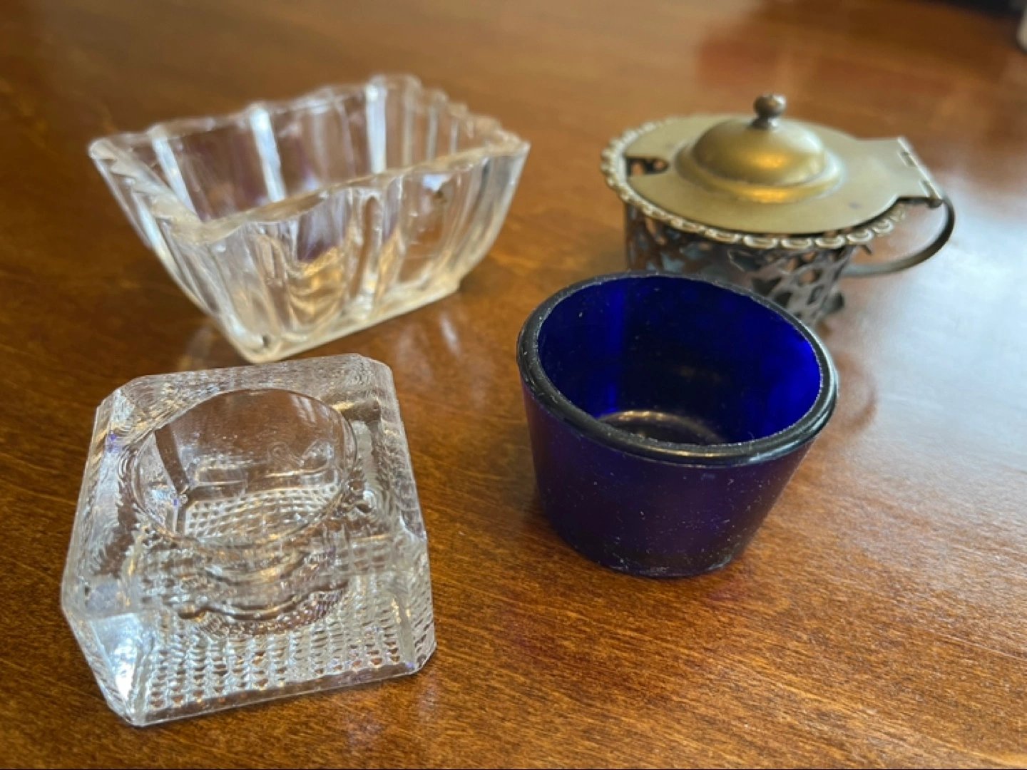 3 antique collectible “salters”, “salt bowls” or “salt cellars”. Used to individually serve salt. One is Silver plated (much is worn off) ornately detailed with lid and Cobalt blue Glass Insert, which is removable and shown separately in one photo.