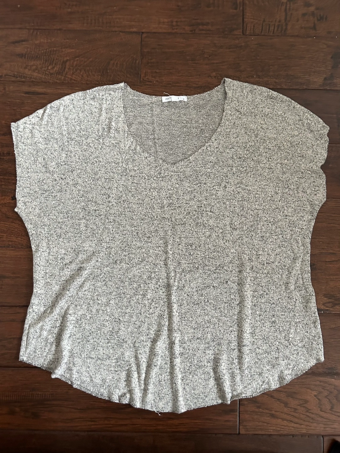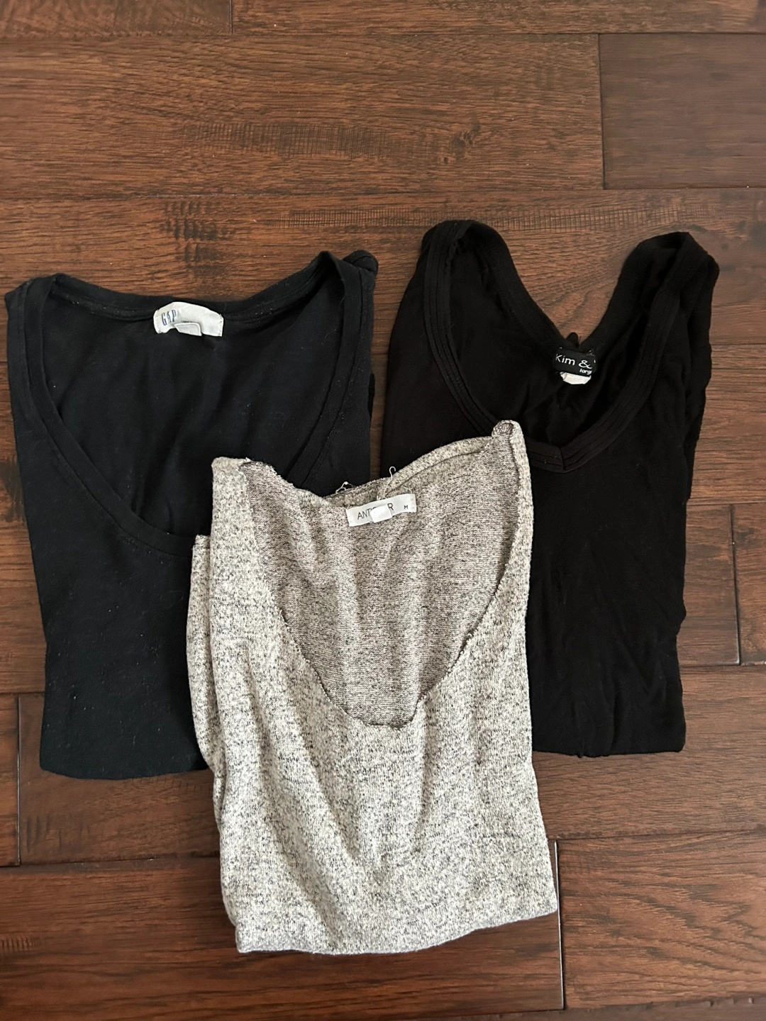 Three women's short-sleeve v-neck tops. One black linen blend, size large. One grey heather, size medium. One black, size large. Good condition.