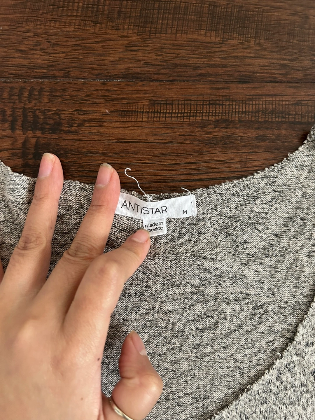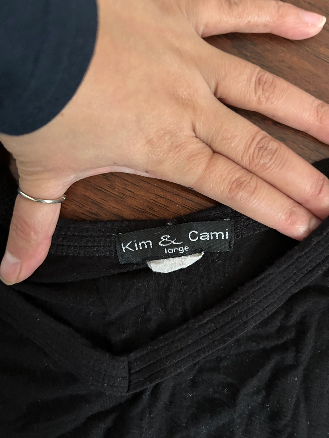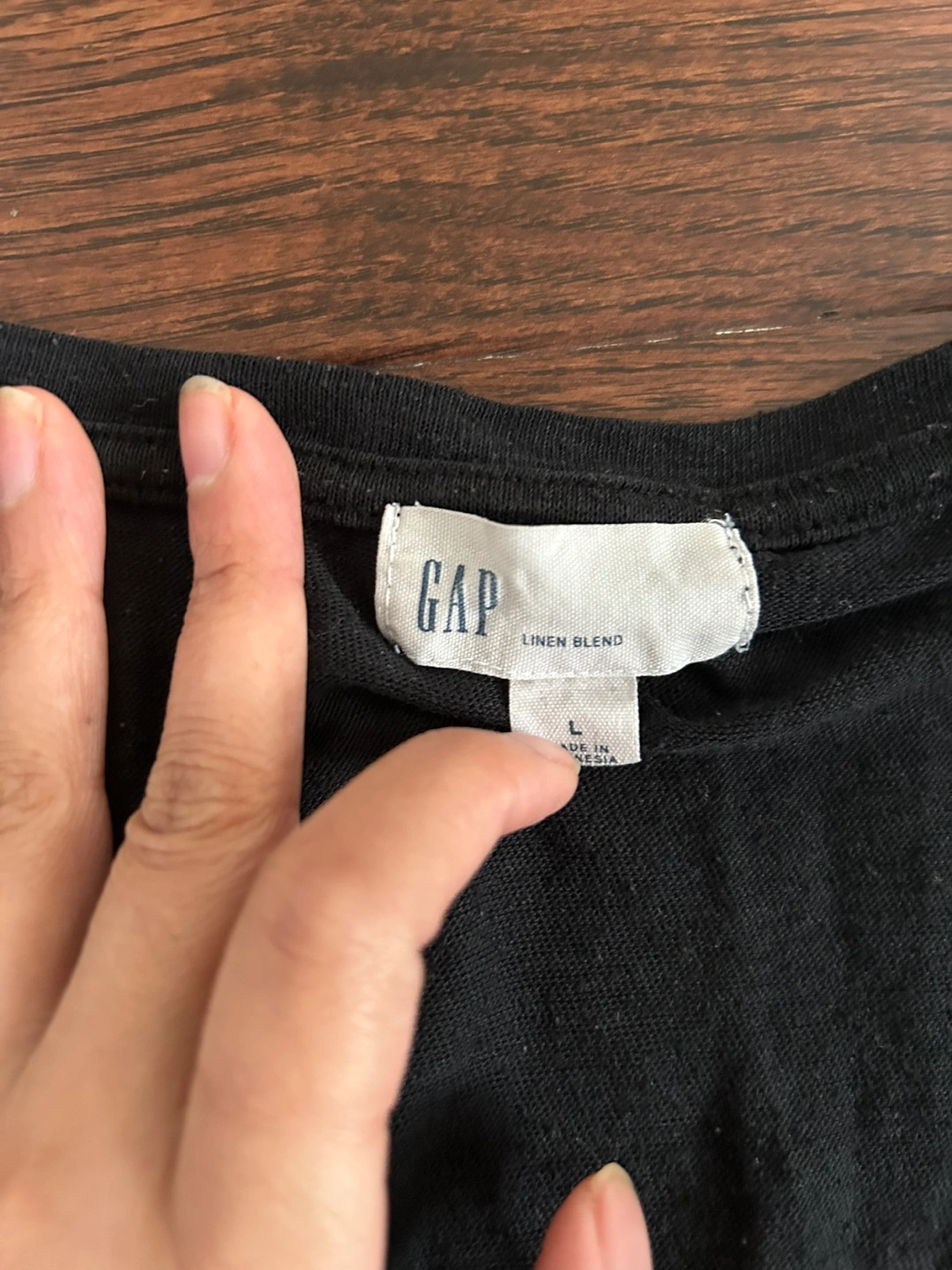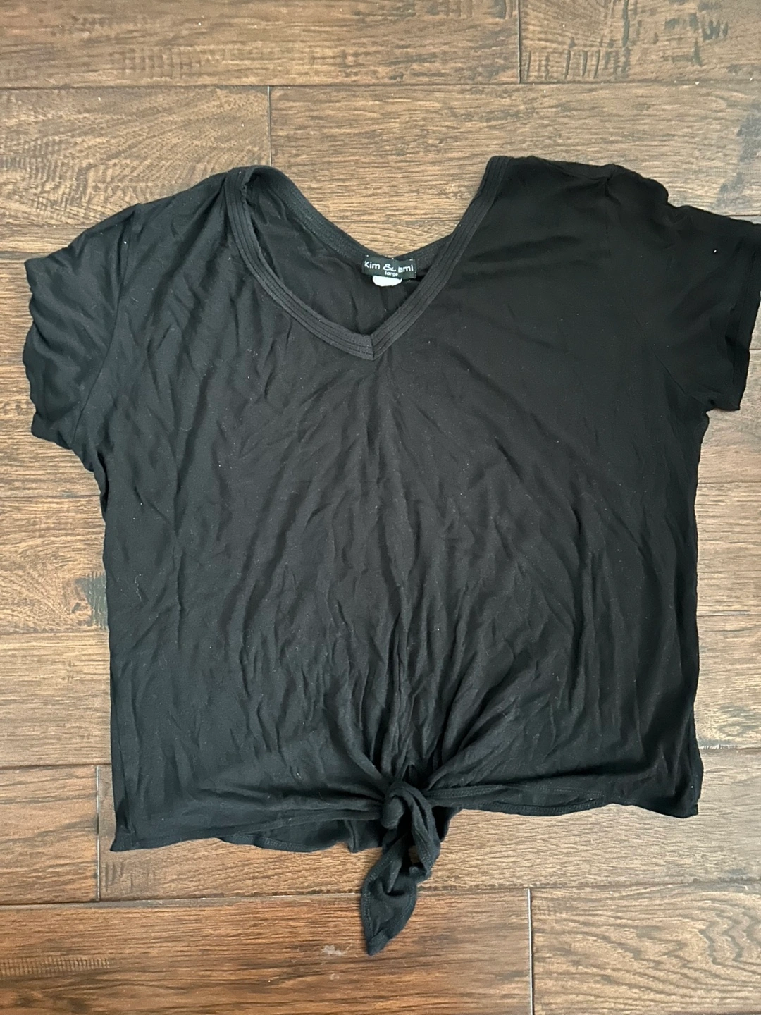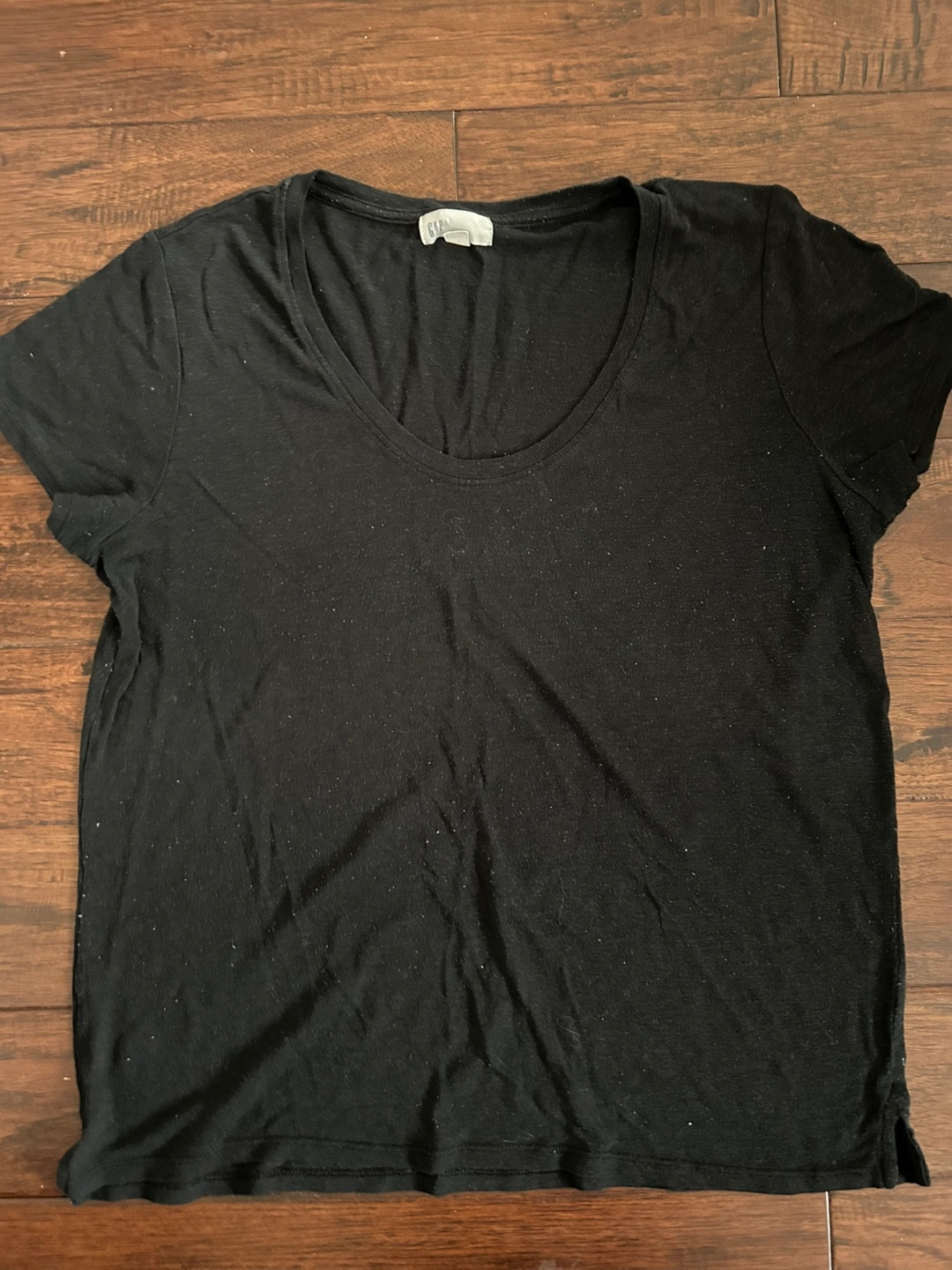 Three women's short-sleeve v-neck tops. One black linen blend, size large. One grey heather, size medium. One black, size large. Good condition.